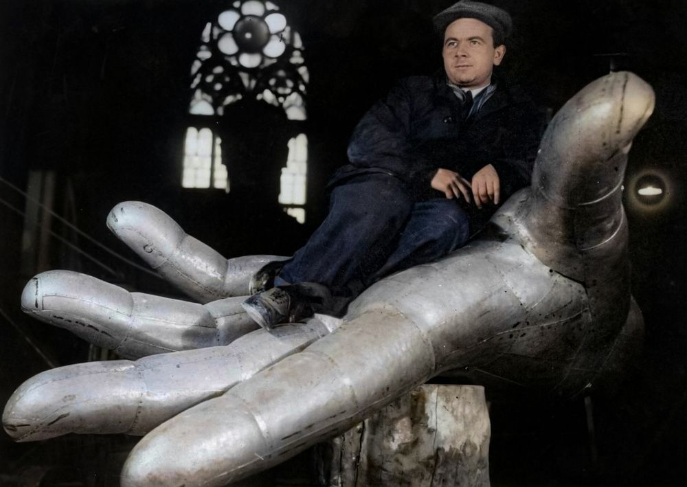 Деталь скульптуры "Рабочий и колхозница" в римско-католическом соборе на Малой Грузинской, 1937-1940 год.Деталь скульптуры "Рабочий и колхозница" в римско-католическом соборе на Малой Грузинской. Монтаж скульптуры перед отправкой в Париж или после возвращения в Москву. Полная сборка скульптуры перед отправкой в Париж происходила на заводе ЦНИИТМАШ.
