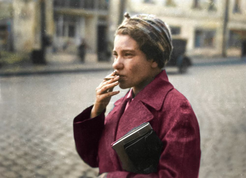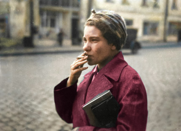 Курящая девушка с книгой подмышкой. Москва, 1935 год.