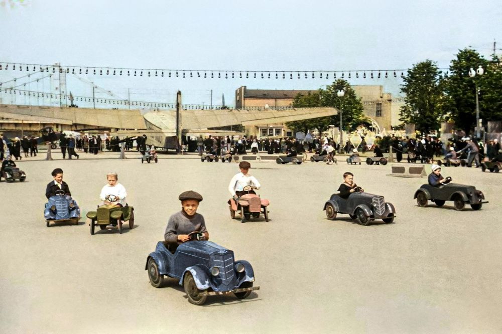 Катание детей на автомобилях в детском городке на территории Парка культуры и отдыха имени Горького. Москва, 1939 год.За периметром территории стоит самолет АНТ-14. Его установили на "вечную стоянку" в парке культуры. Но и там он продолжал служить массовой агитационной работе: вместительный фюзеляж использовали под кинозал для демонстрации научно-популярных и документальных фильмов.