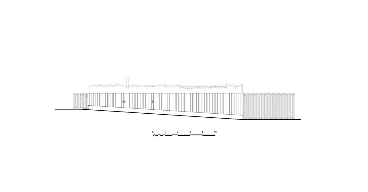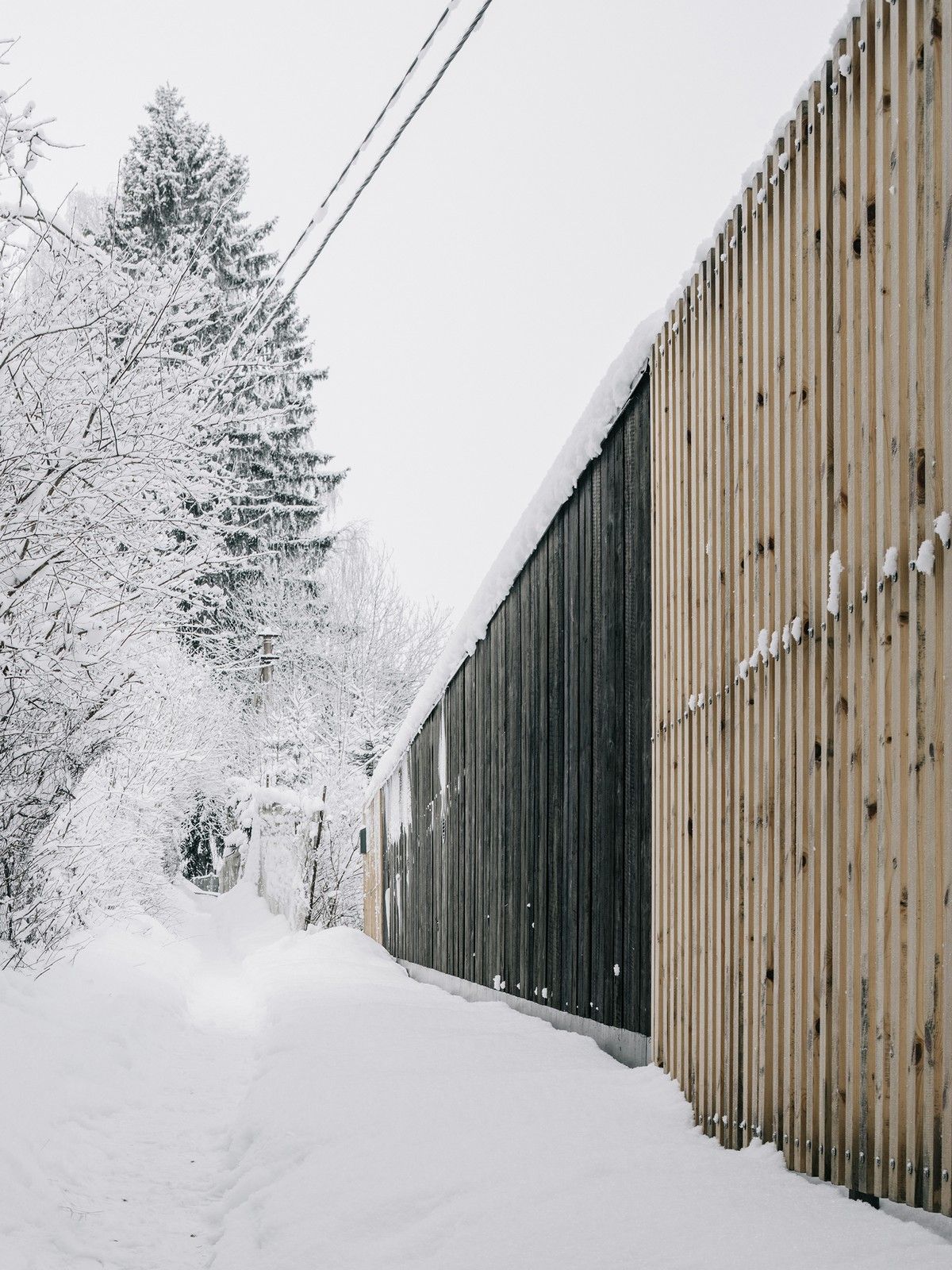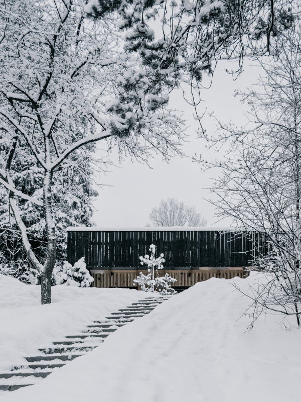 Небольшой одноэтажный деревянный домик площадью 52 квадратных метров построен на краю участка на северном склоне холма, обращенного в сторону озера, и частично заглублен. Фасады дома обшиты старой потемневшей доской, которая придает строению аутентичный вид. Главный фасад с большой полуоткрытой галереей обращен в сторону участка и озера, в то время как задний фасад представляет собой забор вдоль границы участка. Все окна в доме обращены во двор. Кухня, которая размещается в глубине строения, освещается потолочным окном-фонарем. На крыше с небольшим углом ската высажена зеленая трава.Гостевой домик располагает социальной зоной открытого плана, которая включает гостиную, столовую и кухню, а также спальней с тремя кроватями, баней, санузлом и большой на всю ширину здания галереей. Внутренние помещения и галерея отделаны новыми светлыми досками. Парилка выделяется на главном фасаде своей конструктивной стеной из калиброванного бревна. Сдержанный дизайн бани оживляет размещенная в галерее акцентная стальная колонна с двутавровым профилем, которая выкрашена в красный цвет.