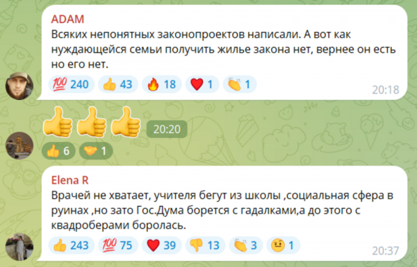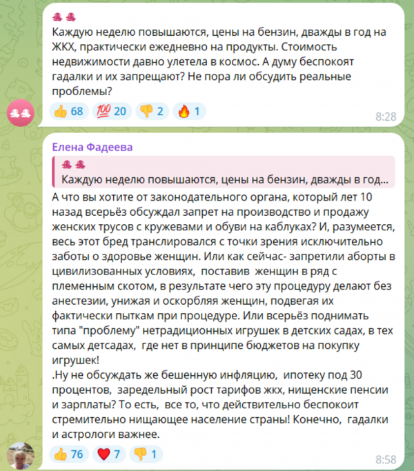 Возможно, рекламу ведунов и правда запретят. Кстати, можете написать - повлияет ли это хоть как-то на вашу жизнь. Потому что в комментариях под публикацией Нины Останины об этом законопроекте, есть много тех, кто не понимает, - зачем сейчас заниматься гадалками, когда есть куда более важные проблемы. Впрочем, есть и те, кто точку зрения депутата полностью разделяет.