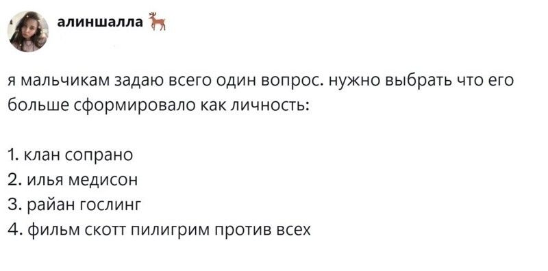 То, что мы слушаем, смотрим, читаем и едим - это не просто предпочтения, а отражение нашей личности, то, что нас сформировало. Вкусы - это язык, на котором мы говорим о себе, даже если молчим. Кино, книги, музыка, еда, юмор и не только - это и способ рассказать миру, кто мы такие. Любите экспериментальный джаз и острые блюда? Возможно, вы авантюрист, готовый пробовать новое. Обожаете боевики и пюре с котлетой? Скорее всего, вы ценитель простых радостей жизни. Пользователи обсудили один из опросников и поделились своими наблюдениями за тем, как вкусы формируют наше восприятие мира.