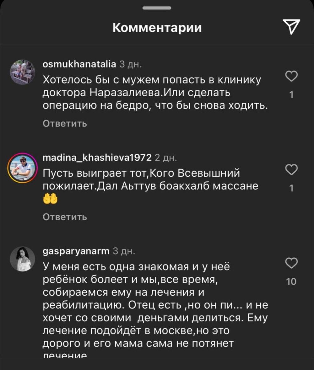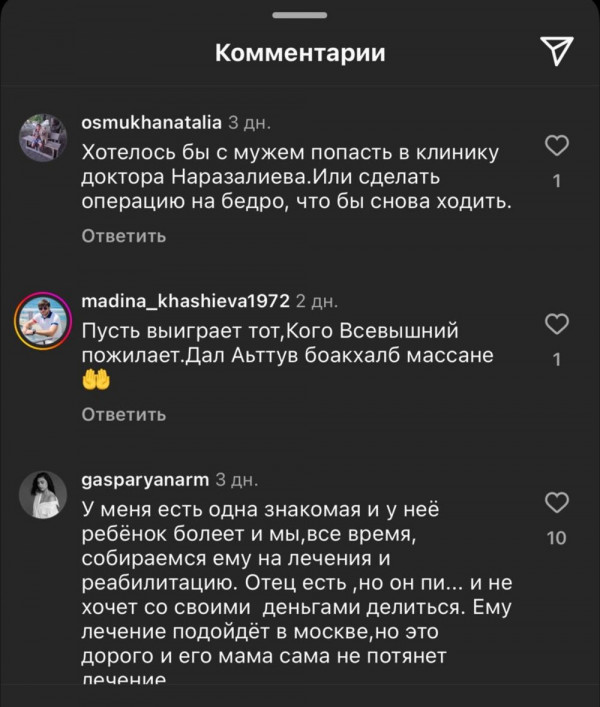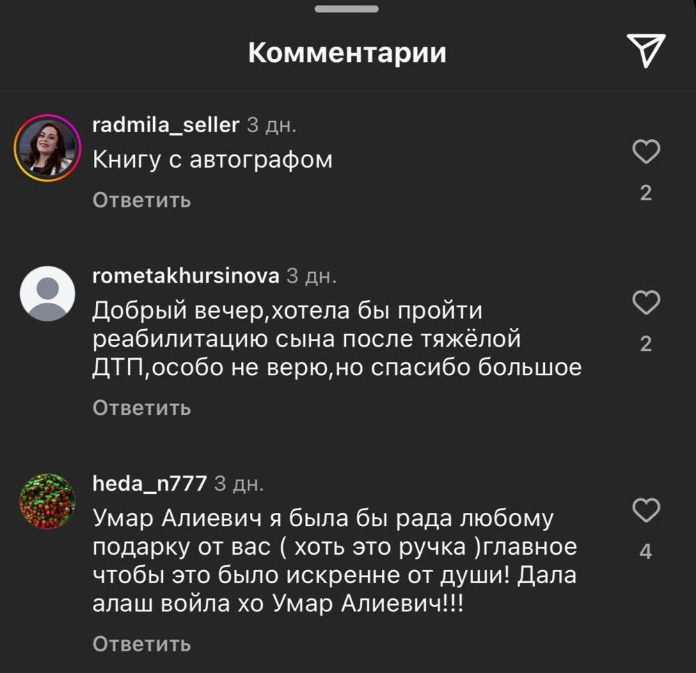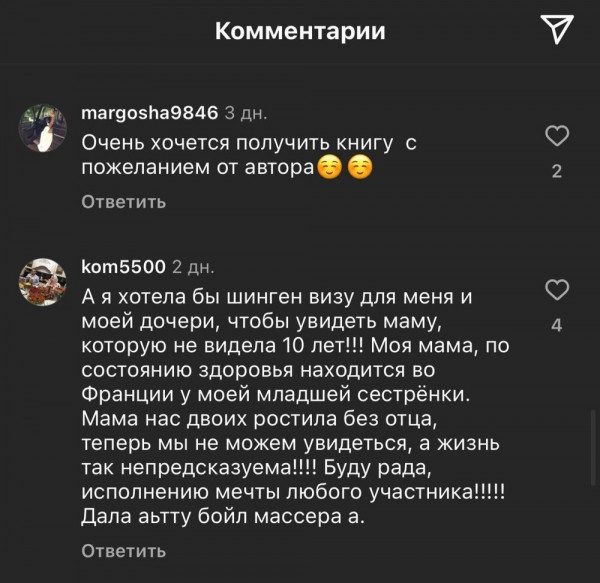 Подписчиц в аккаунте бизнесмена много, поэтому сотни женщин поспешили поделиться своими мечтами. Среди них были трогательные и щемящие: одна из женщин просила об операции мужу на бедре, чтобы он снова начал ходить, другая 10 лет не видела родную мать и мечтала хоть не надолго обнять родного человека, третья собирала деньги на реабилитацию больного ребёнка подруги...