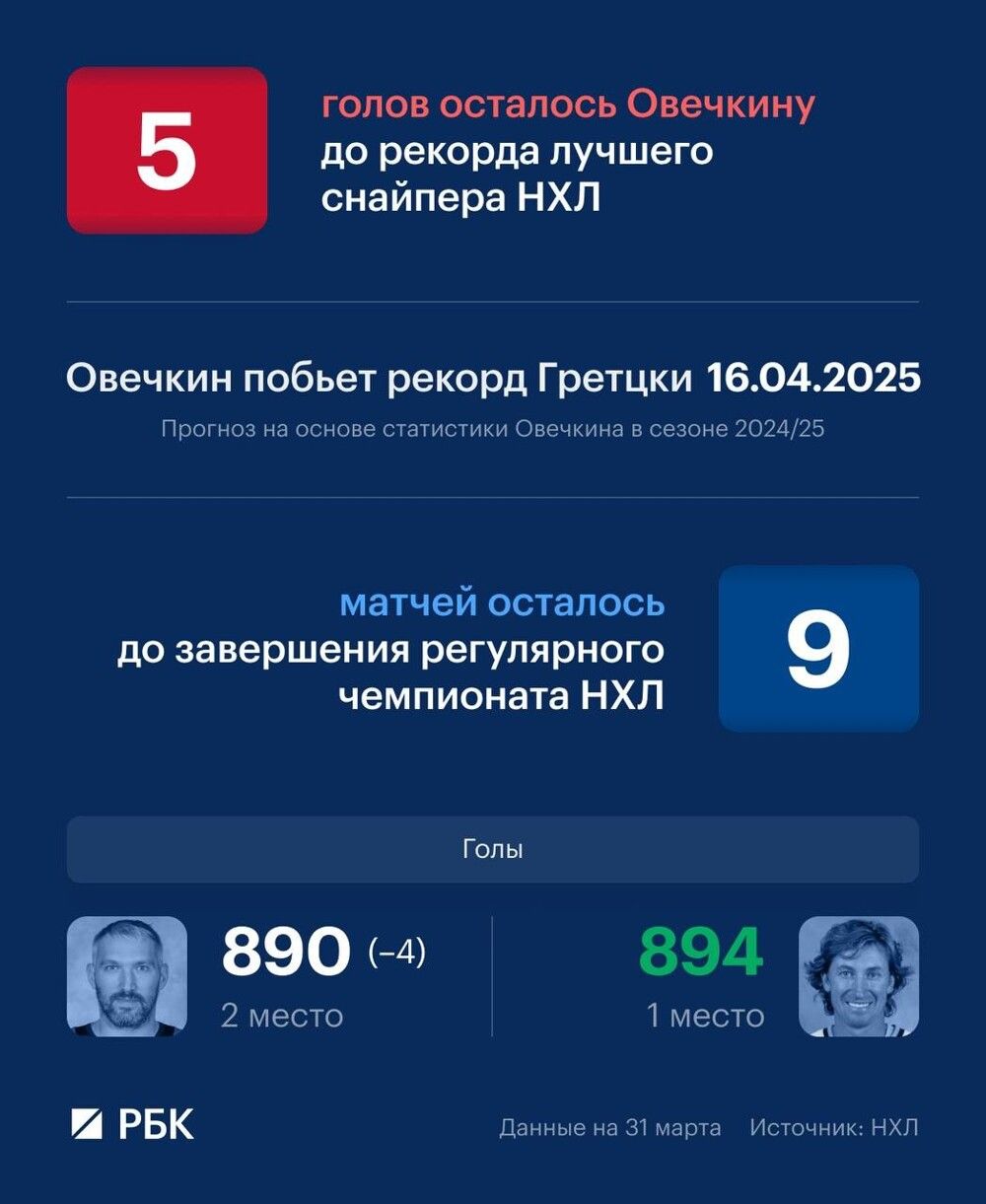 Сообщается, что Александр Овечкин в воскресенье забросил в ворота "Баффало Сейбрз" свою 890-ю шайбу в НХЛ и сократил отставание от рекорда Уэйна Гретцки до четырех голов. Что касается самой встречи, то она прошла не так радужно - команда "Кэпиталз" уступила оппонентам со счётом 8:5.В регулярных чемпионатах НХЛ 39-летнем Овечкину осталось забить всего 5 шайб, чтобы превзойти Гретцки (у него 894 гола). Спортивные издания, в том числе российские, уже составляют прогнозы. Учитывая результативность Овечкина в 0,65 шайбы за игру (37 голов в 56 матчах), побить рекорд он сможет уже к середине апреля.