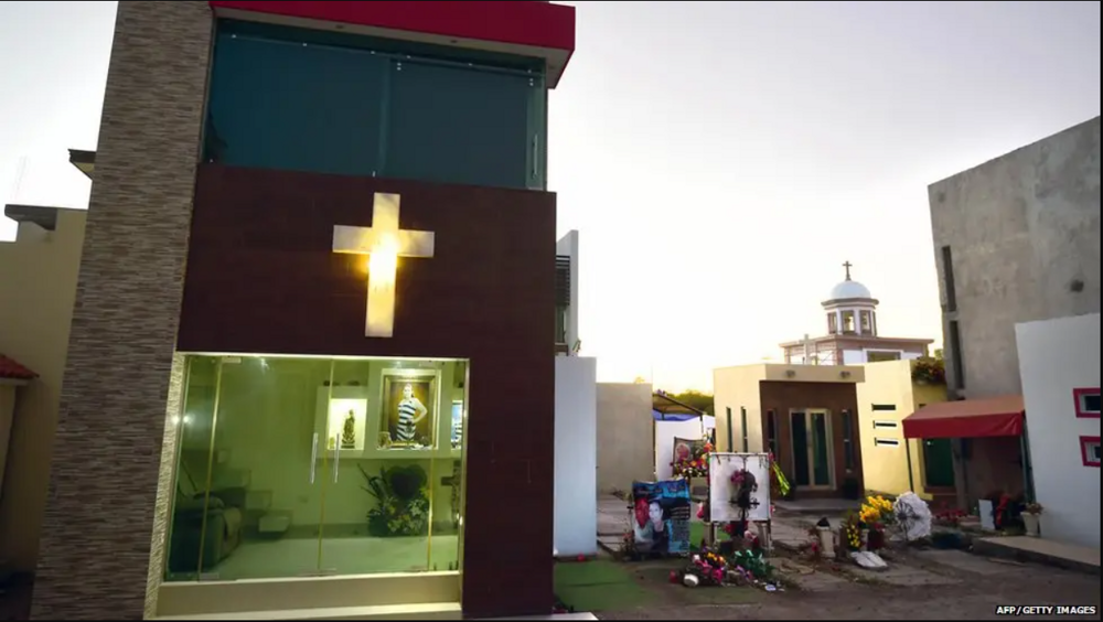 И не удивительно, на улицах не особняки и виллы, а мавзолеи на могилах местной братвы из наркокартеля Sinaloa. Многие из таких сооружений стоят не один миллион долларов, но картель не жалеет денег для своих баронов, павших в борьбе с государством или с конкурентами. О размерах их выручки и оборота наркотических средств, которые они продают, можно составить впечатление по этому кладбищу.Думаете, что это пафосный пафос, как бы не так. Оказывается все гораздо сложнее. "Это выражение силы, которой они когда-то обладали, и проявление их стремления к вечности, что естественно для любого человека", - отмечает Хуан Карлос Айяла, профессор философии в Автономном университете Синалоа, специализирующийся на "наркокультуре".