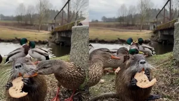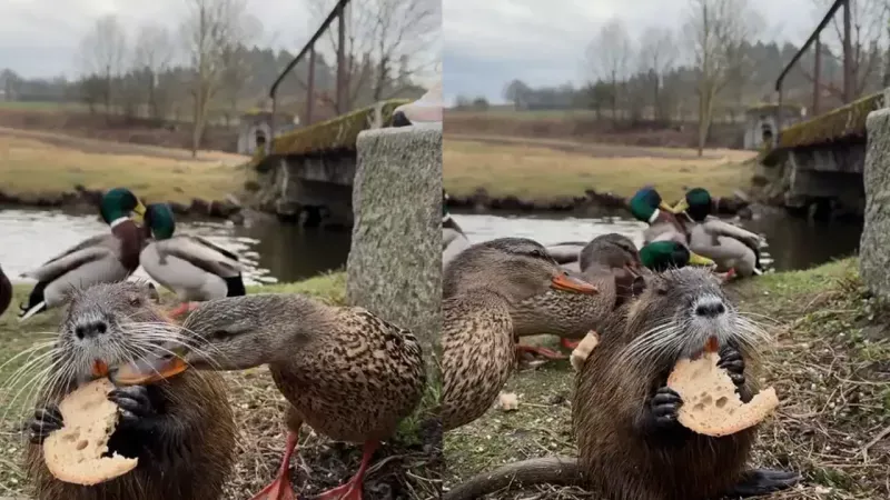 Одна из уток настойчиво пытается выхватить лакомый кусок у бобра, который, казалось бы, совершенно не замечает ее усилий и продолжает спокойно пережевывать хлеб, не обращая ни малейшего внимания на суету вокруг.