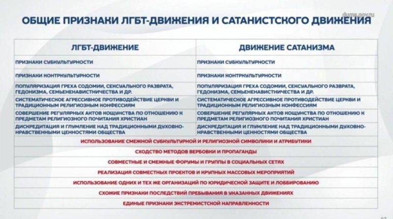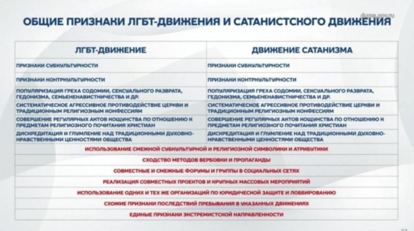 Надо посмотреть, на какие деньги, на какие средства живут эти сатанисты? Где печатаются их книги, плакаты, кто платит за концерты, за шоу, за представления, за аренду залов, баров, клубов? То есть кто заказчики?Епископ Скопинский и Шацкий Питирим заявил о том, что в России растёт количество магов, экстрасенсов, тарологов и прочих колдунов. Затем он поведал, как одна дама при нём общалась по телефону и вроде бы сказала, что устанавливала контакт с внутренними органами:Я думаю, с кем она там разговаривала, с МВД, что ли? А потом оказалось, что она с кишками разговаривает, со своей печенью и селезёнкой! Представляете, до какой глупости дошло.А руководитель исполкома общественного движения "Культурный фронт России" Вячеслав Леонтьев сравнил сатанизм с нацизмом и призвал к "спасению цивилизации святой любви":Слово взял иерей Федор Лукьянов и заявил, что ЛГБТ* и сатанизм между собой связаны. А в доказательство показал таблицу с общими признаками этих движений: