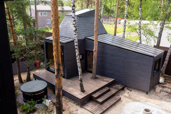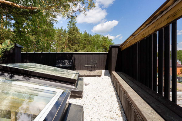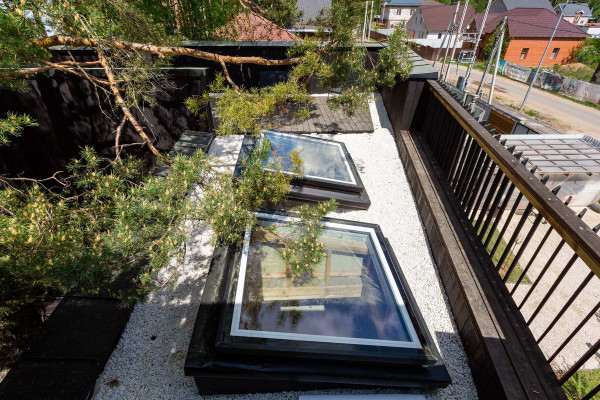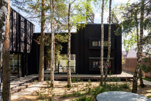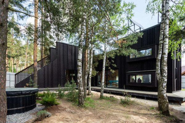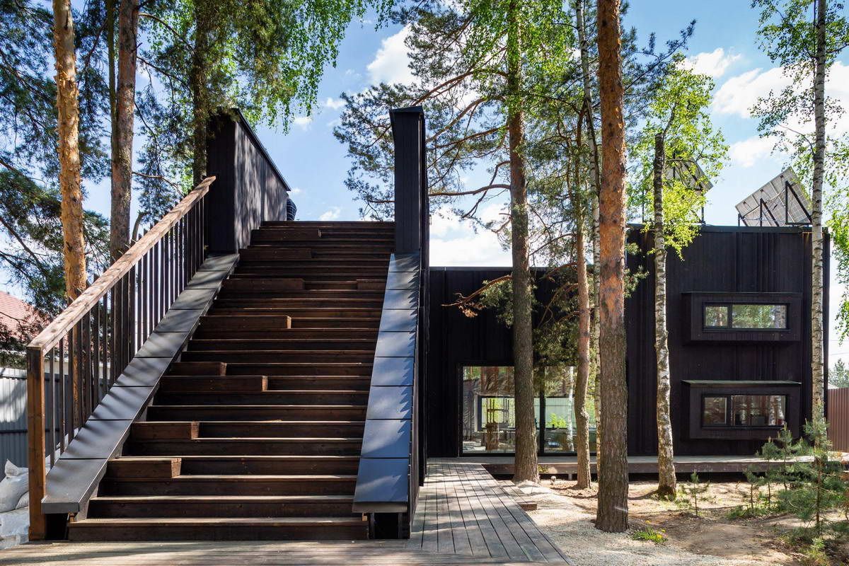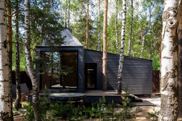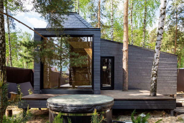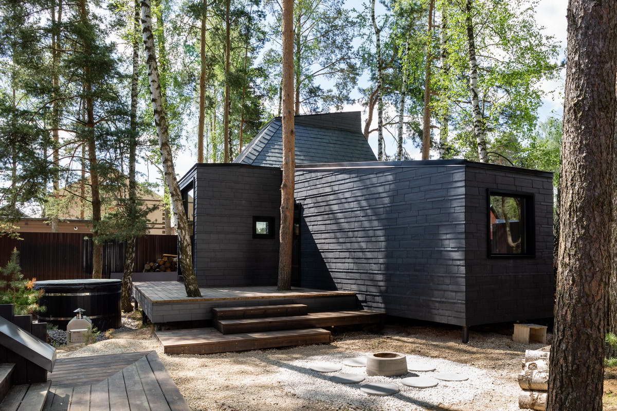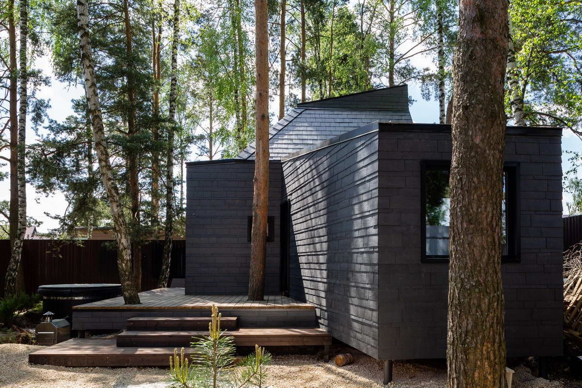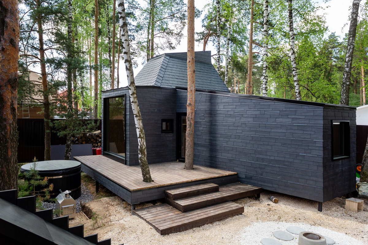 Кровля главного дома - эксплуатируемая, с ведущей на неё лестницей-амфитеатром. Стандартная ровная площадка приобрела ландшафтную доминанту. С кровли главного дома и с лестницы-амфитеатра открывается прекрасный вид на лес и закат. По периметру дома расположена терраса - это одновременно альтернатива садовым дорожкам и ландшафтная мебель: на террасе можно сидеть, лежать и в целом это переходное пространство между интерьером и экстерьером участка. Площадь Г-образного в плане главного дома изначально планировалась не больше 80 квадратных метров, но в процессе проектирования и строительства высота увеличилась до 6 м (включая парапеты), что позволило добавить антресольный этаж, а общая площадь выросла до 92 м2.На первом этаже расположены мастер-спальня (14 м2) со своим санузлом (4 м2), гостевой санузел (3 м2), сауна (3,5 м2), небольшая гостевая спальня с антресольным этажом для кровати (9 м2). Универсальное пространство гостиной объединено с кухней, каминной зоной, библиотекой и зоной для удаленной работы (38,4 м2). Кроме того, в доме будут расположены зона для zoom-конференций на антресоли (12 м2), прихожая (1,6 м2) и холл (8,5 м2). Места для хранения, которые обычно располагаются в подвале, в проекте будут расположены над санузлами на антресолях. Пространство дома за счёт высоких потолков стало трёхмерным и по характеру это архитектурная мастерская, скомпонованная из разновысоких объёмов, открывающихся друг в друга.