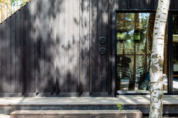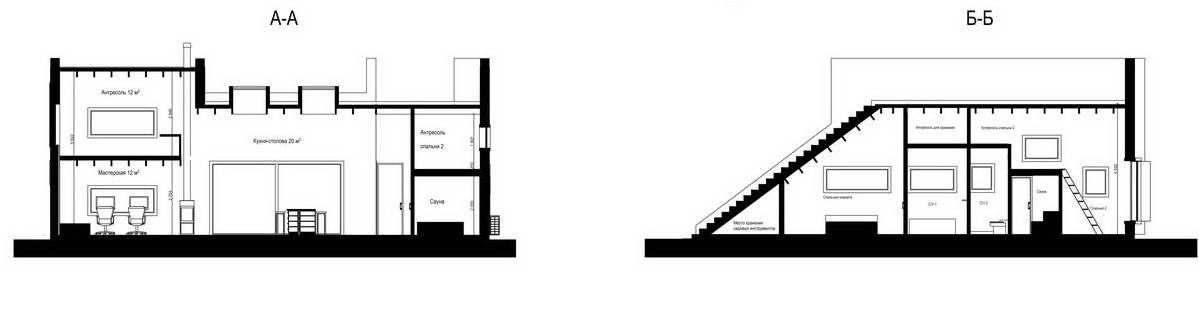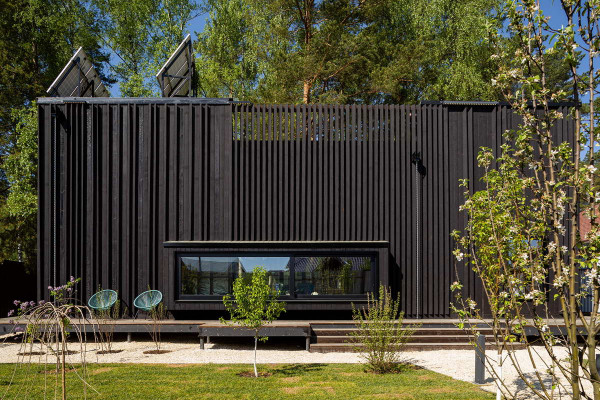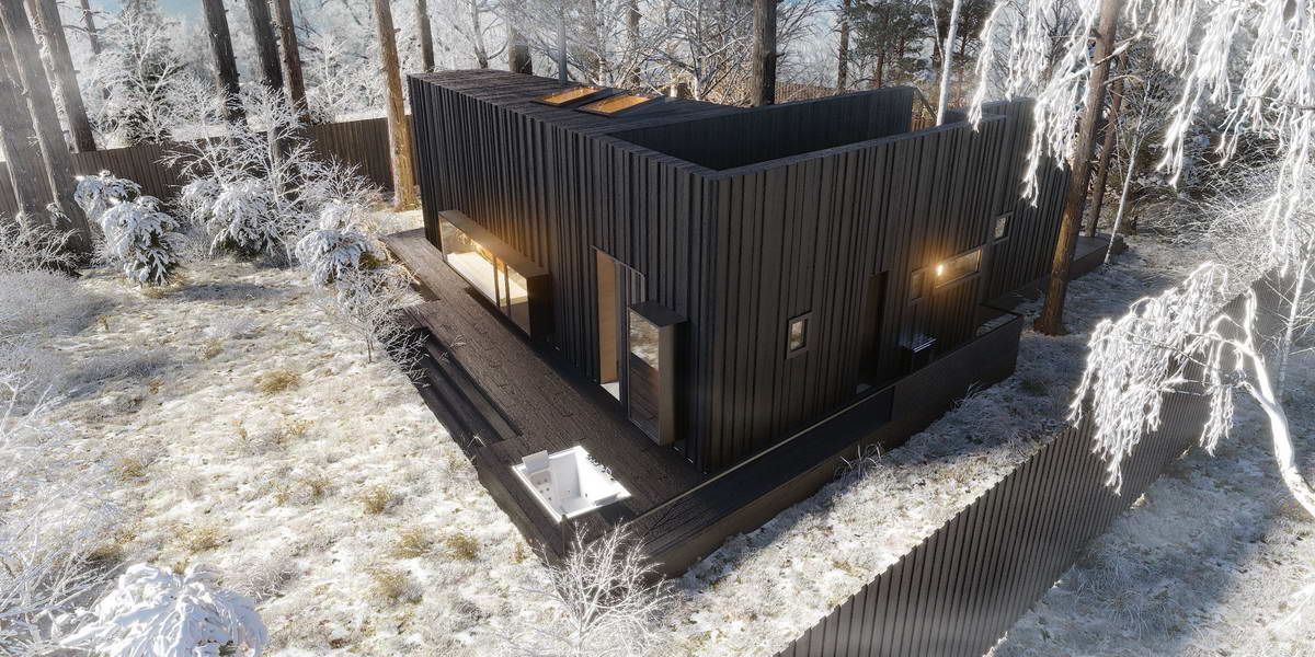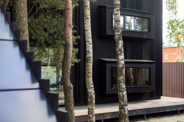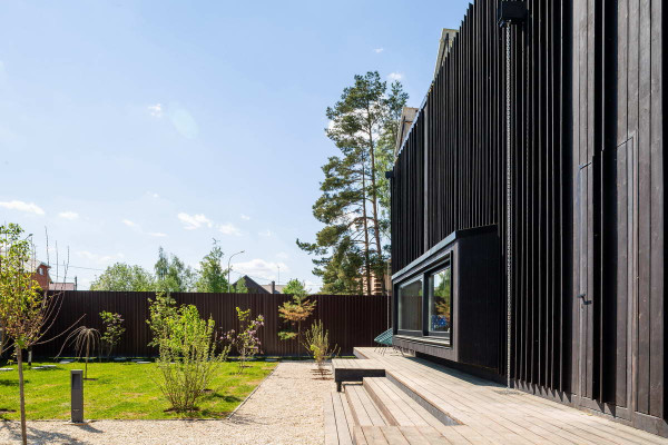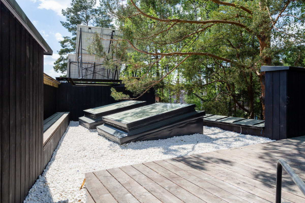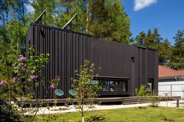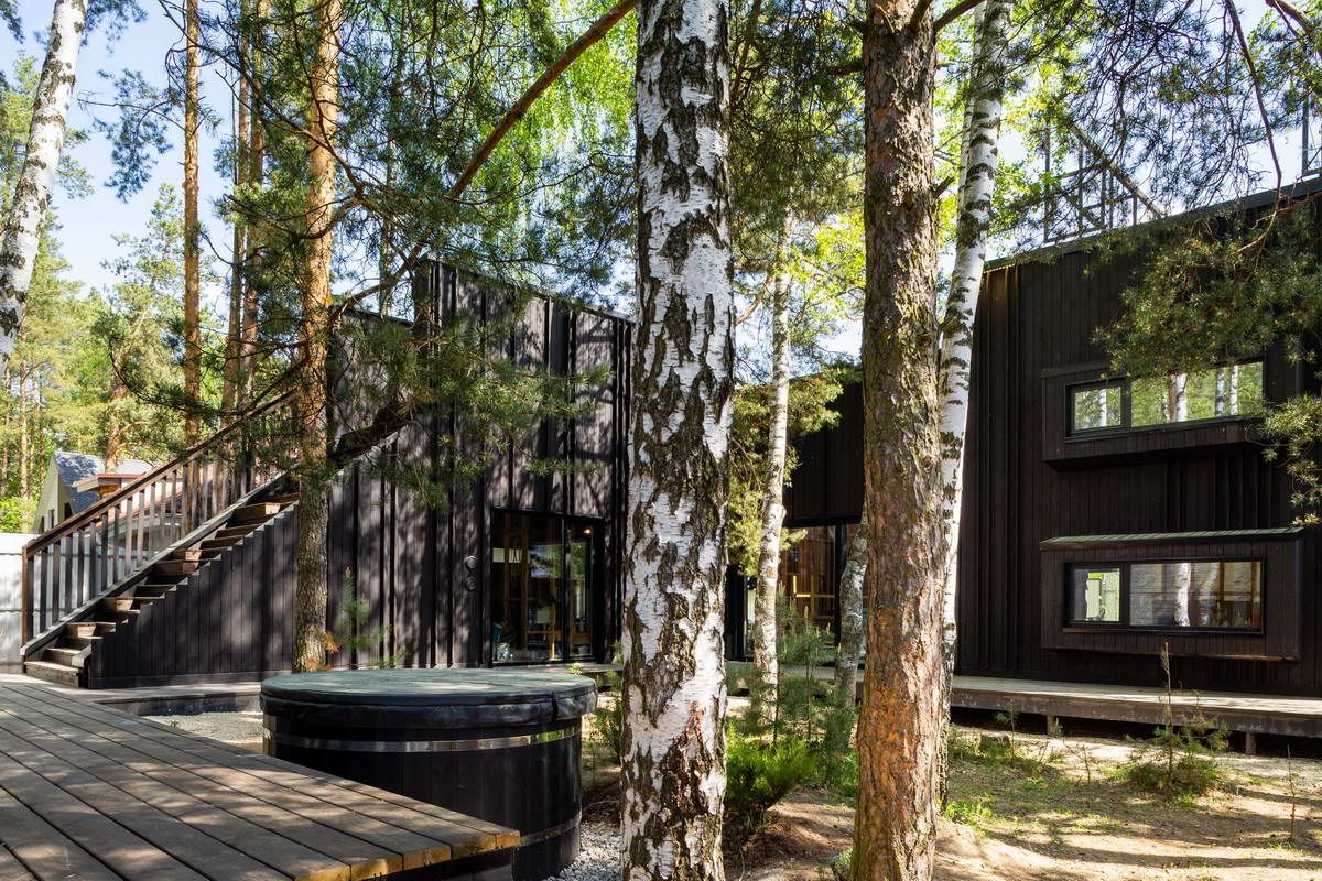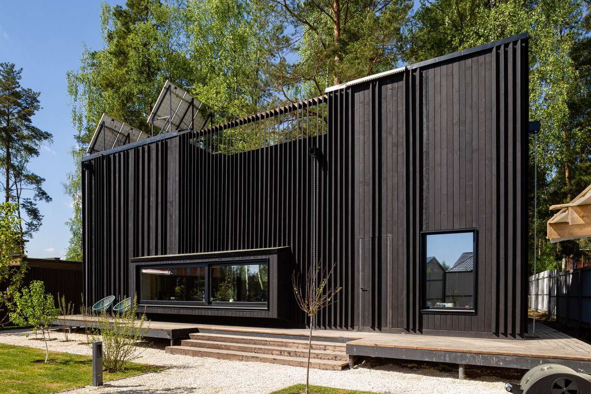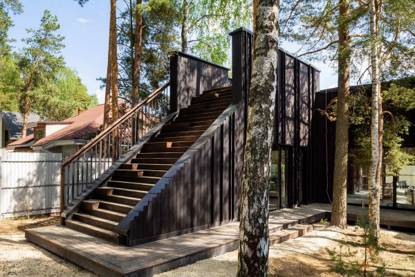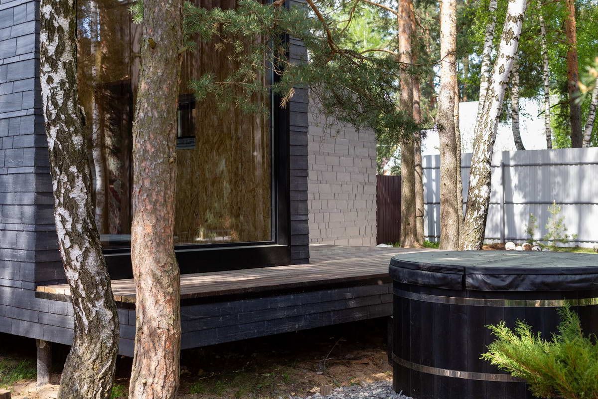 Кровля главного дома - эксплуатируемая, с ведущей на неё лестницей-амфитеатром. Стандартная ровная площадка приобрела ландшафтную доминанту. С кровли главного дома и с лестницы-амфитеатра открывается прекрасный вид на лес и закат. По периметру дома расположена терраса - это одновременно альтернатива садовым дорожкам и ландшафтная мебель: на террасе можно сидеть, лежать и в целом это переходное пространство между интерьером и экстерьером участка. Площадь Г-образного в плане главного дома изначально планировалась не больше 80 квадратных метров, но в процессе проектирования и строительства высота увеличилась до 6 м (включая парапеты), что позволило добавить антресольный этаж, а общая площадь выросла до 92 м2.На первом этаже расположены мастер-спальня (14 м2) со своим санузлом (4 м2), гостевой санузел (3 м2), сауна (3,5 м2), небольшая гостевая спальня с антресольным этажом для кровати (9 м2). Универсальное пространство гостиной объединено с кухней, каминной зоной, библиотекой и зоной для удаленной работы (38,4 м2). Кроме того, в доме будут расположены зона для zoom-конференций на антресоли (12 м2), прихожая (1,6 м2) и холл (8,5 м2). Места для хранения, которые обычно располагаются в подвале, в проекте будут расположены над санузлами на антресолях. Пространство дома за счёт высоких потолков стало трёхмерным и по характеру это архитектурная мастерская, скомпонованная из разновысоких объёмов, открывающихся друг в друга.