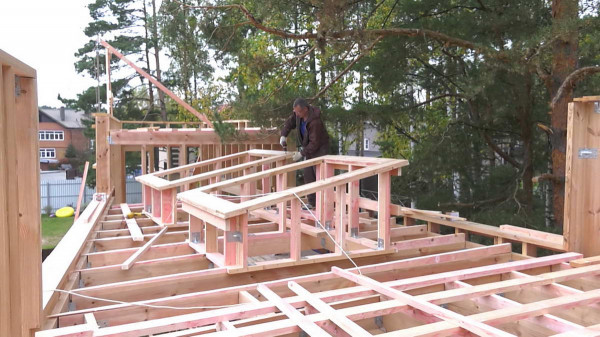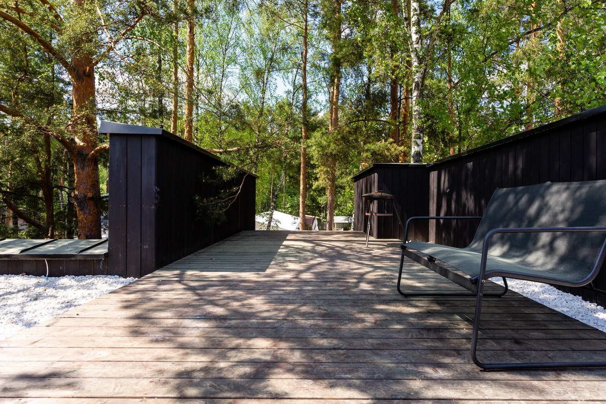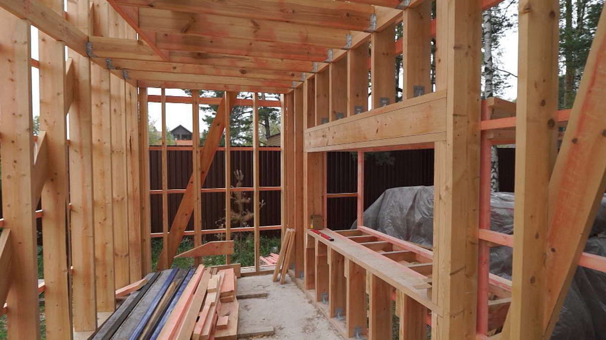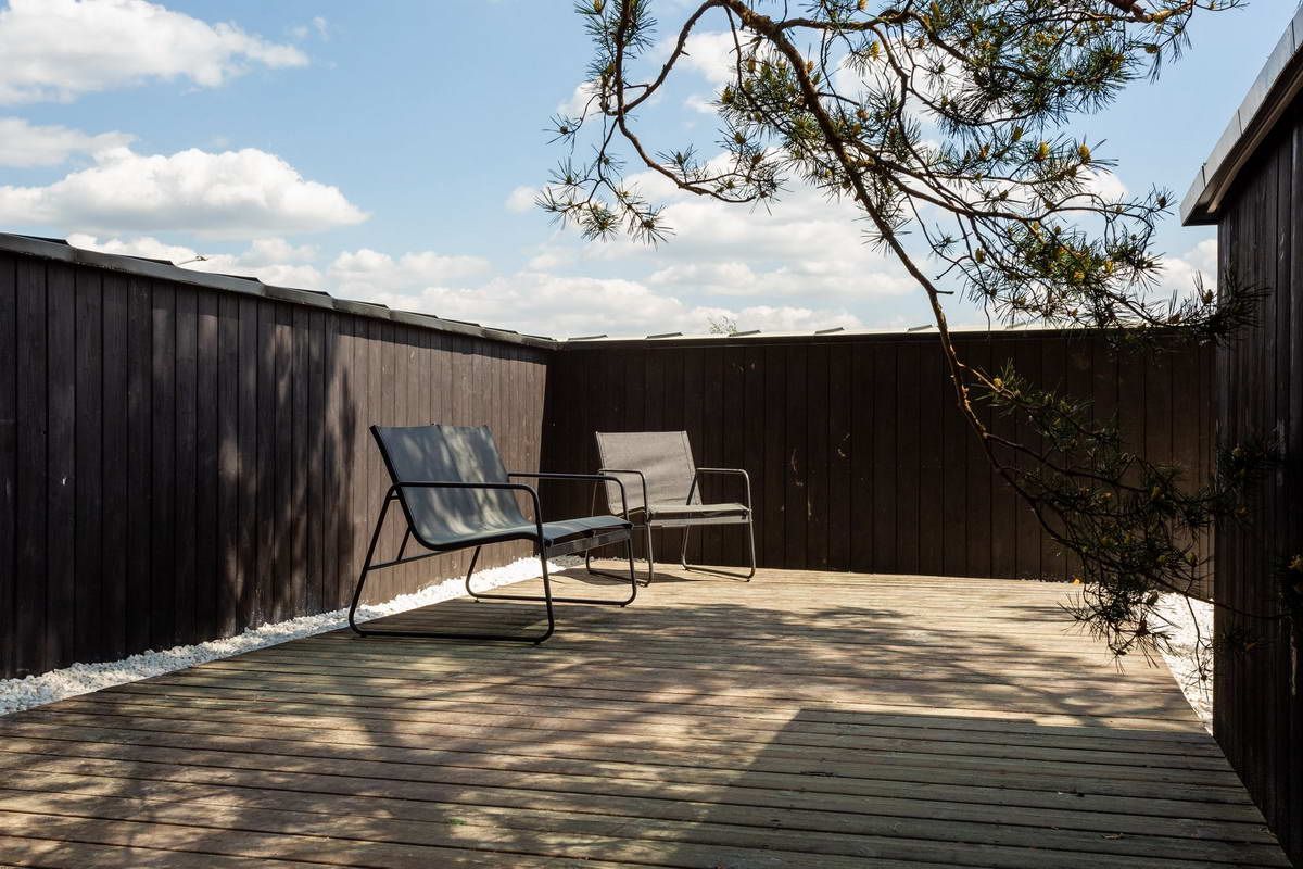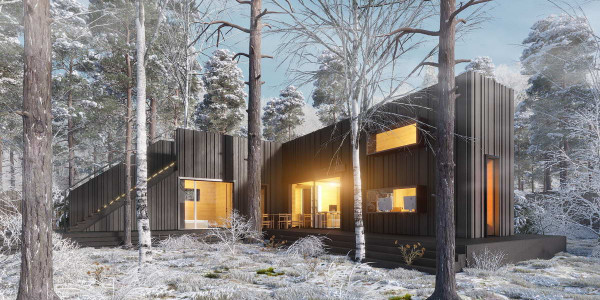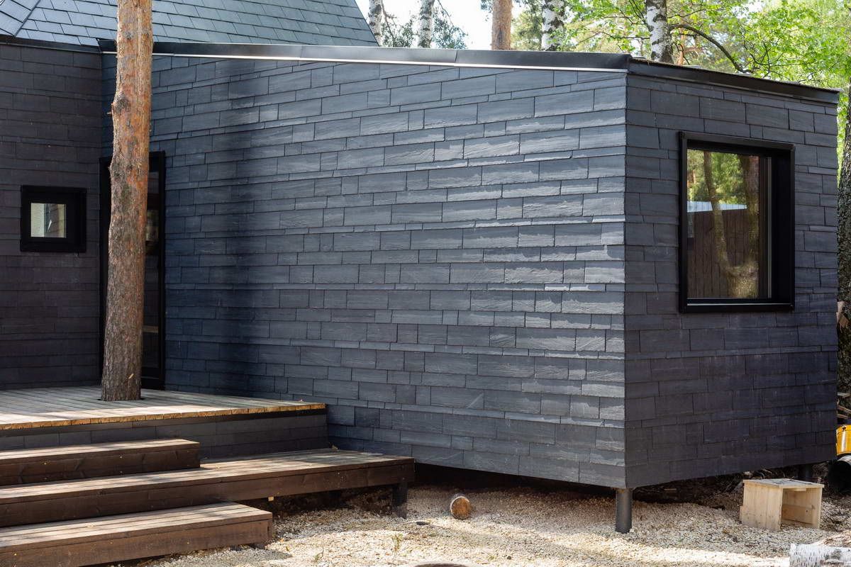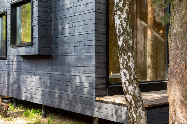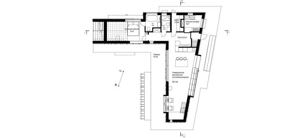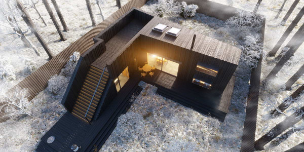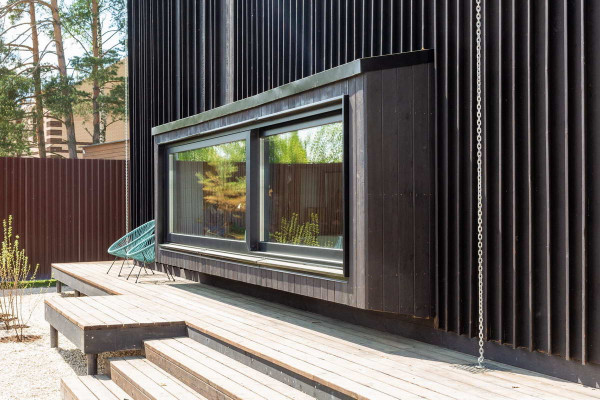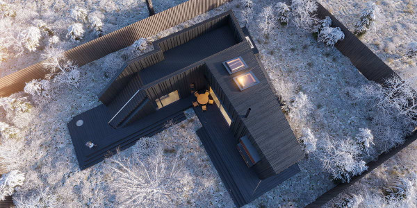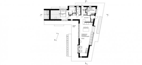Кровля главного дома - эксплуатируемая, с ведущей на неё лестницей-амфитеатром. Стандартная ровная площадка приобрела ландшафтную доминанту. С кровли главного дома и с лестницы-амфитеатра открывается прекрасный вид на лес и закат. По периметру дома расположена терраса - это одновременно альтернатива садовым дорожкам и ландшафтная мебель: на террасе можно сидеть, лежать и в целом это переходное пространство между интерьером и экстерьером участка. Площадь Г-образного в плане главного дома изначально планировалась не больше 80 квадратных метров, но в процессе проектирования и строительства высота увеличилась до 6 м (включая парапеты), что позволило добавить антресольный этаж, а общая площадь выросла до 92 м2.На первом этаже расположены мастер-спальня (14 м2) со своим санузлом (4 м2), гостевой санузел (3 м2), сауна (3,5 м2), небольшая гостевая спальня с антресольным этажом для кровати (9 м2). Универсальное пространство гостиной объединено с кухней, каминной зоной, библиотекой и зоной для удаленной работы (38,4 м2). Кроме того, в доме будут расположены зона для zoom-конференций на антресоли (12 м2), прихожая (1,6 м2) и холл (8,5 м2). Места для хранения, которые обычно располагаются в подвале, в проекте будут расположены над санузлами на антресолях. Пространство дома за счёт высоких потолков стало трёхмерным и по характеру это архитектурная мастерская, скомпонованная из разновысоких объёмов, открывающихся друг в друга.