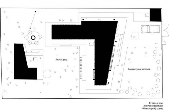 Небольшой участок находится на границе леса и поля. Дома расположены между деревьев в лесной части, а фасад главного дома - вдоль красной линии застройки со стороны поля. Идея генплана заключалось в том, чтобы на очень небольшом пространстве участка создать два контрастных двора. Один - лесной, с естественным ландшафтом, второй - сад цветущих и плодовых деревьев.