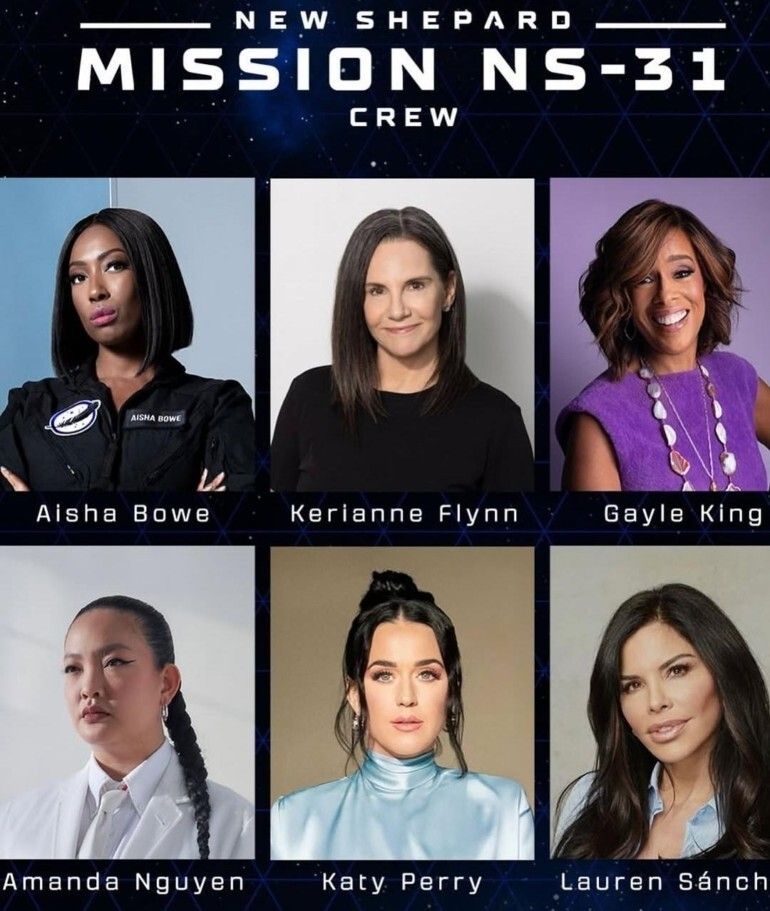 На борту корабля будут находиться: журналистка, предпринимательница и невеста Безоса Лорен Санчес, певица Кэти Перри, телеведущая Гейл Кинг, аэрокосмический инженер и предприниматель Айша Боу, активистка Аманда Нгуен, кинопродюсер Кериэнн Флинн. Полёт продлится 11 минут.