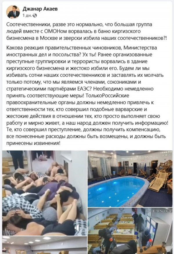 Также в министерстве иностранных дел Киргизии призвали объяснить "силовые меры" против киргизов и "в случае необоснованности применения силы" попросили "принять соответствующие меры", не только в отношении силовиков, принимавших участие в рейде, но и в отношении защиты прав граждан республики. Российскую сторону попросили впредь не допускать ситуаций, которые могут нанести вред взаимоотношениям между государствами.Инцидент, о котором идёт речь, произошёл в пятницу вечером 11 апреля. Сотрудники ОМОНа наведались в банный комплекс "Бодрость" после жалоб местных жителей. Некоторые СМИ писали, что произошло из-за того, что баня оказывала услуги только мигрантам, а русских туда не пускали. В ходе рейда силовики уложили всех посетителей бани на пол (всего 40 человек), а затем отвезли в отдел. В ходе проверки на нескольких приезжих составили административные протоколы о нарушении режима въезда и пребывания в России (ст. 18.8 КоАП РФ), а в отношении их начальника инициировали проверку по уголовной статье об организации незаконной миграции (ст. 322.1 УК РФ).