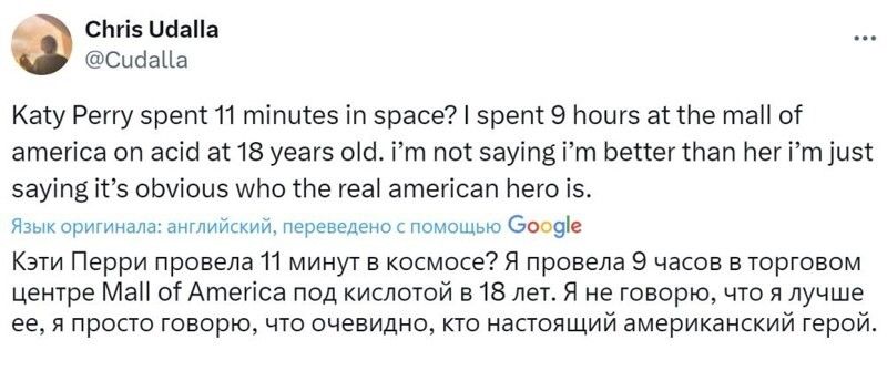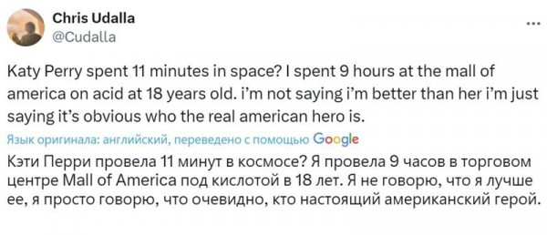 Космическое путешествие длилось около 11 минут. За это время шесть женщин, включая певицу Кэти Перри и её подруг, здорово потешили своё самолюбие и стали героинями соцсетей. Пусть и на пару дней.