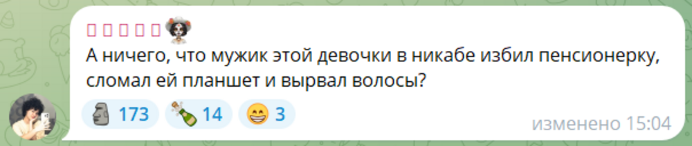 Осторожно, в роликах есть матюги:В тг-каналах есть свидетельство очевидца происшествия. По его словам, дело было так:Сначала пенсионерке сломали планшет, на который она снимала, этот мужик и бил её, и вырывал волосы, после чего она попыталась защититься, сняв никаб с женщины. А он её повалил и бил ногами. Он изначально отобрал планшет у женщины и разбил его, женщина в никабе просто сидит спокойно, никто её не трогал.Но это чьё-то частное мнение и официально оно не подтверждено.На видео попал момент начала драки и её продолжение.На следующей станции всех участников скандального инцидента забрали в полицию и составили протокол о мелком хулиганстве. А сегодня состоялся суд по этому делу - на нём выступила пенсионерка и ещё раз подчеркнула, что не начинала конфликт и не лезла в драку. По её мнению, агрессор - это спутник девушки в никабе.Но в ходе процесса слова пожилой дамы опровергли и установили, что она проявила неуважение к обществу, "пытаясь снять элемент одежды (никаб) с женщины, хватая её за голову". Поэтому она получила 7 суток ареста:Признать виновной в совершении административного правонарушения, предусмотренного ч. 1 ст. 20.1 КоАП РФ "Мелкое хулиганство" и назначить ей наказание в виде административного ареста сроком на семь суток.
