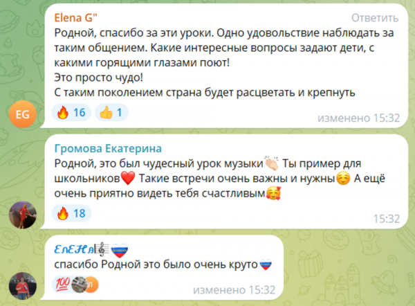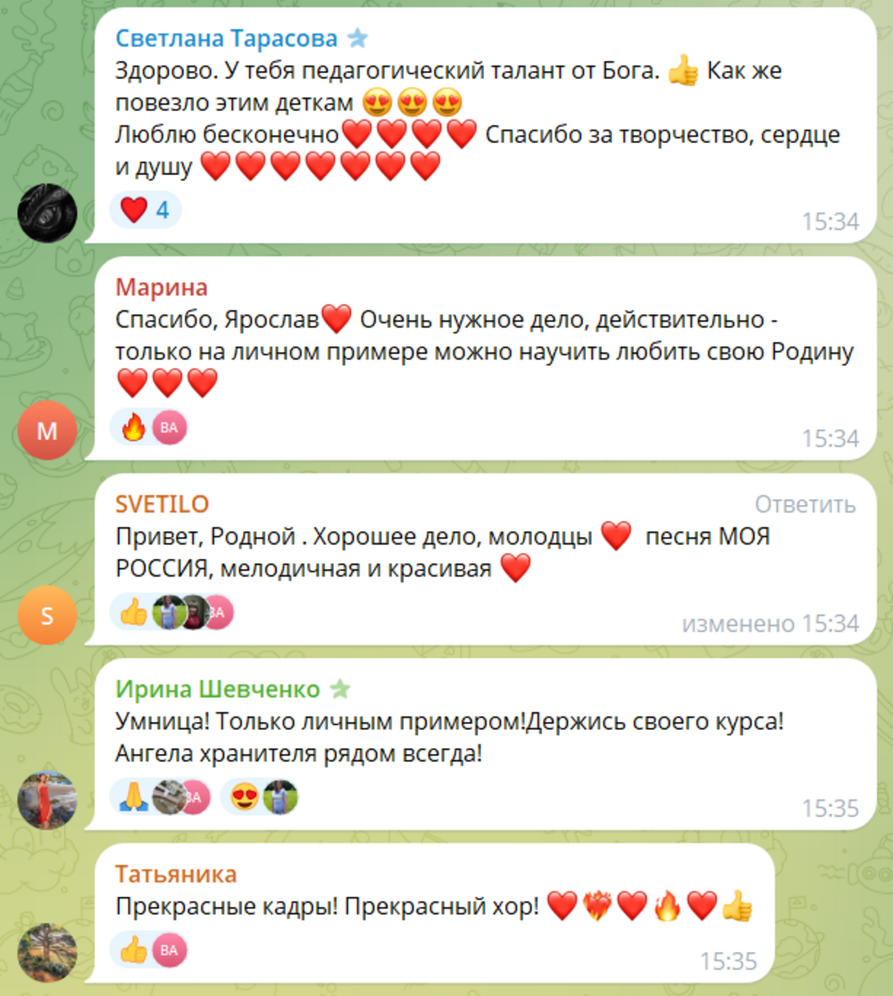 И лицей, и вуз - это кузница кадров для российской и мировой науки. А Шаман пообщался с учениками 7-8 классов и поведал им, как написал первые песни, рассказал о технике распевки перед выступлением и прочие музыкальные тонкости.Также Ярослав высказался о важности песен о родном крае и о их роли в обществе. В пример привёл свою песню "Моя Россия", потом исполнил её с надрывом и выложил фрагмент в тг-канале:Вот какие комменты были под его публикацией.