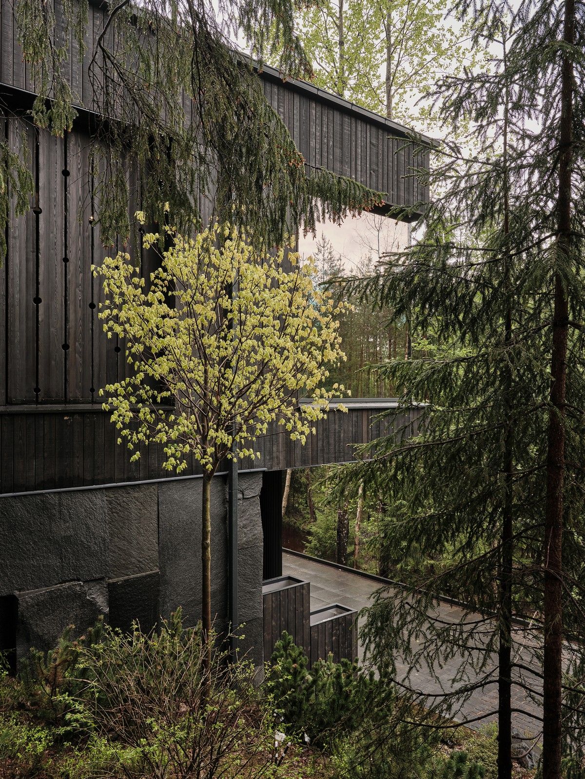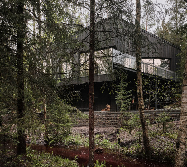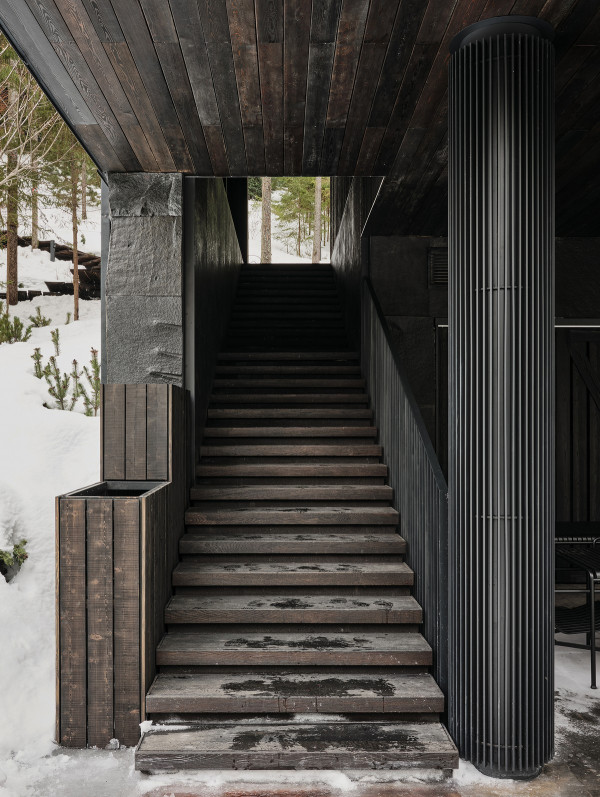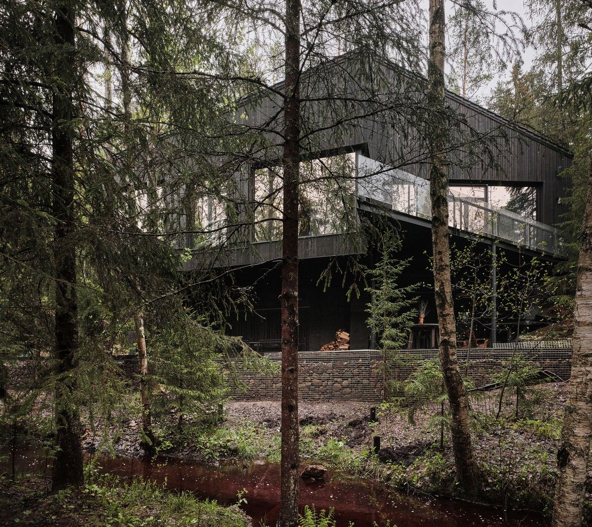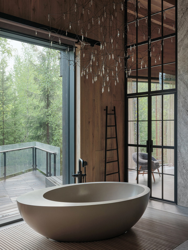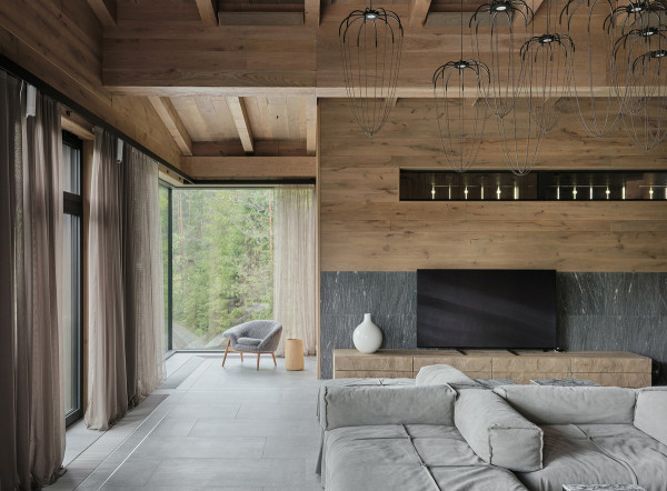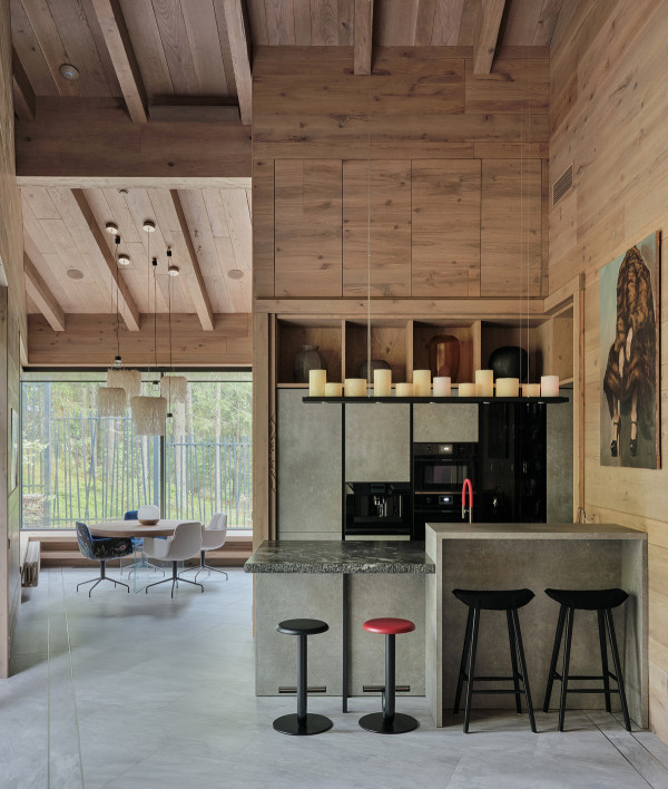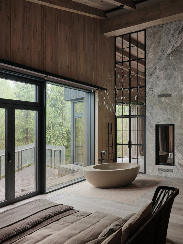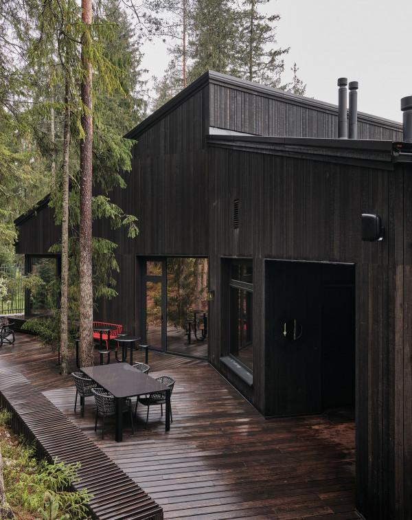 Архитектурная концепция здания сформирована особенностями рельефа и учитывает все природные ценности местности. Нижний этаж, включающий в себя гараж, гардеробную, винную комнату, кладовую и подсобные помещения, воспринимается как часть холмистого ландшафта. На верхнем этаже расположены основные функциональные пространства - социальная и приватная зоны.При строительстве дома приоритет был отдан местным натуральным материалам, которые способствовали созданию гармонии с окружающим лесом. Так, для облицовки фасадов использованы древесина лиственницы темного цвета и габбро-диабаз, уникальный чёрный камень субвулканической горной породы из Карелии, который не только обеспечивает современный стиль зданию, но и отражает культурную историю региона. Для внутреннего оформления дома выбран натуральный дуб, который используется для отделки стен и потолков. Теплое светлое дерево делает интерьер особенно привлекательным и по-домашнему уютным.В оформлении экстерьера использованы не только элементы современной архитектуры, но и детали, отражающие исторические и культурные традиции региона. Так, деревенский стиль объекту придают раздвижные ставни на окнах, украшенные традиционным русским резным орнаментом. Учитывая, что в оформлении дома доминирует натуральная древесина, на балконе второго этажа предусмотрен подъемный механизм, позволяющий организовать, в случае необходимости, беспрепятственный проезд пожарного автомобиля.Минималистичный интерьер выполнен с доминированием светлой цветовой гаммы, резко контрастирующей с темным экстерьером. Несмотря на то, что в оформлении внутренних пространств используется камень, интерьер смотрится необыкновенно легким и теплым. Кроме того, эффектное сочетание камня и дерева привносит в пространство ощущение природной свежести и выразительности.Социальная зона открытого плана включает в себя гостиную, столовую и кухню. Стеклянные раздвижные двери связывают ее с большой открытой террасой, прекрасно оборудованной для отдыха на природе. Отсюда открывается завораживающий вид на лес и протекающий внизу ручей. Большой разнонаправленный диван позволяет любоваться прекрасными видами на лес с любой стороны. Расположенный рядом камин привносит ощущение особенного уюта и располагает к приятным посиделкам.Прекрасно оборудованная современная кухня впечатляет компактностью. Барные стулья разной высоты идеально подходят для размещения не только взрослых, но и детей. Нотки деревенского стиля привносит в оформление зоны верхний свет, который вместо традиционных светильников использует множество свечей. Элегантно оформлена обеденная зона. Вокруг деревянного круглого стола установлены стулья, обитые бархатом, что придает пространству особенный шарм. Стильно смотрятся пушистые натуральные подвески, которые, подобно облакам, свисают с потолочных ламп.Стеклянные двери во всю высоту помещения связывают социальную зону с приватной, создавая ощущение единого гибкого пространства. Центром внимания спальни является отдельно стоящая каменная ванная с видом на зеленый лес. Над ней, ассоциируясь со звездным балдахином, нависает массивная люстра со множеством огней. Туалетный каменный столик с раковиной также находятся в открытом пространстве. Перфорированные оконные ставни идеально
