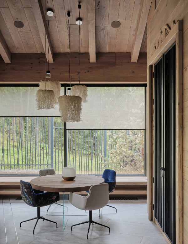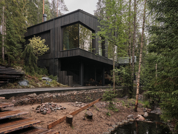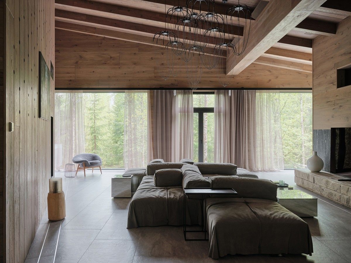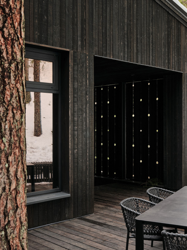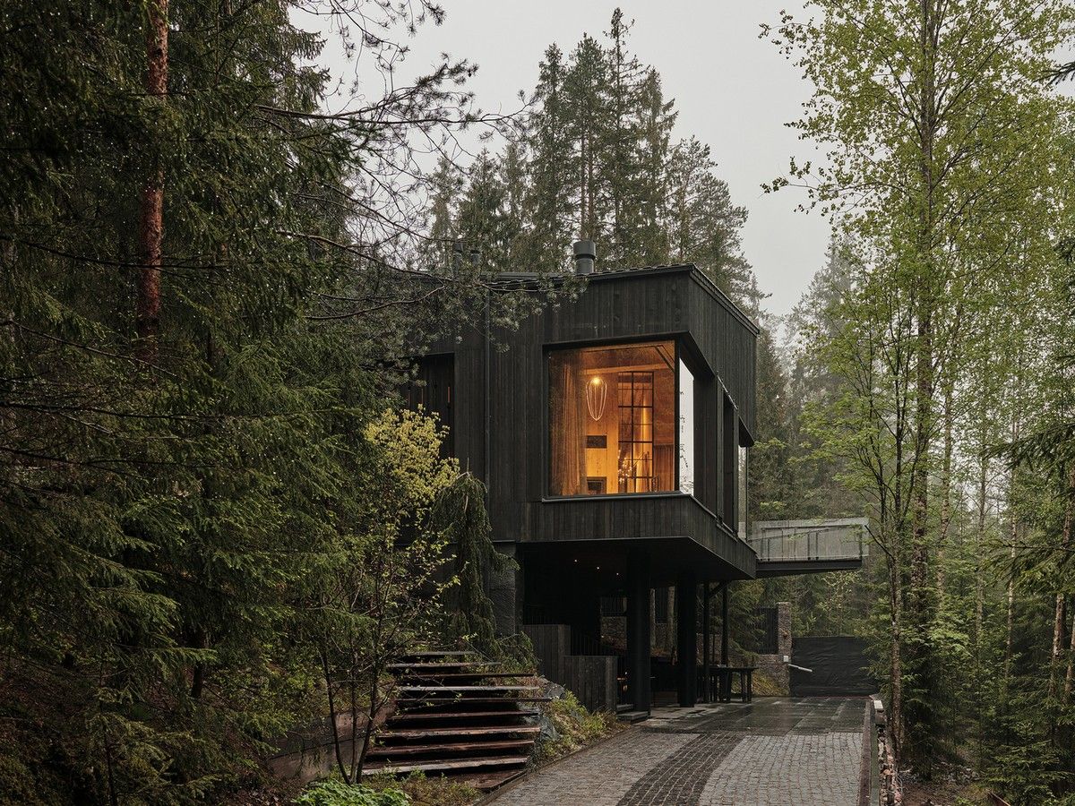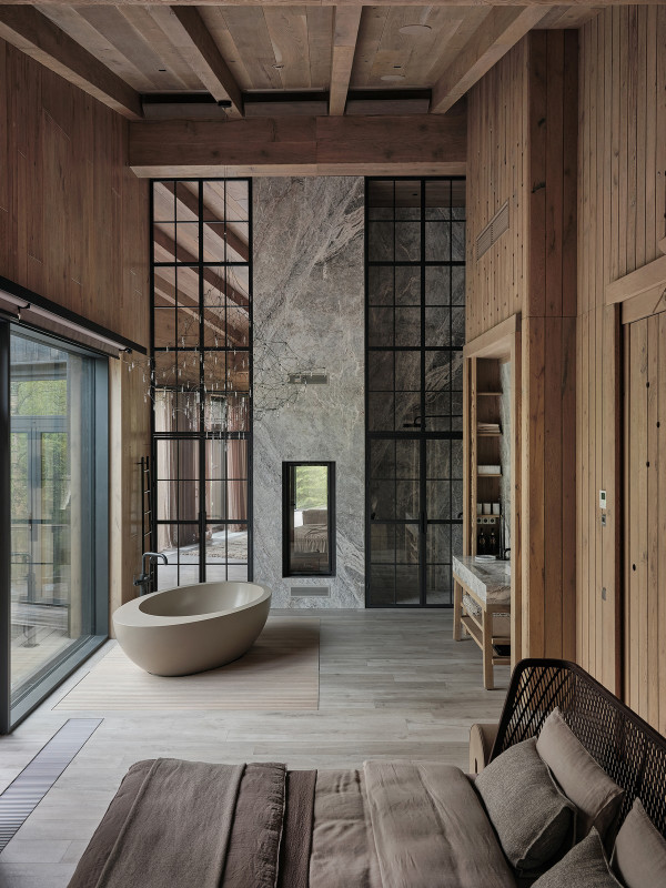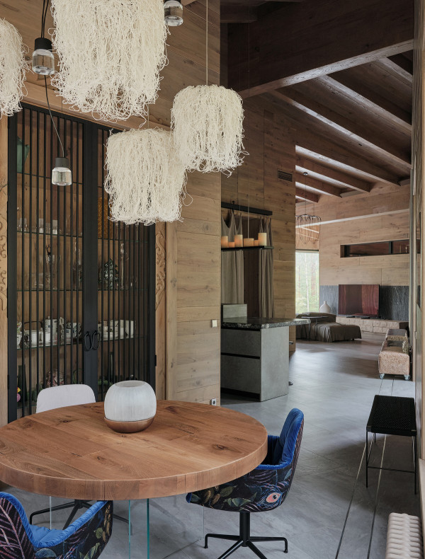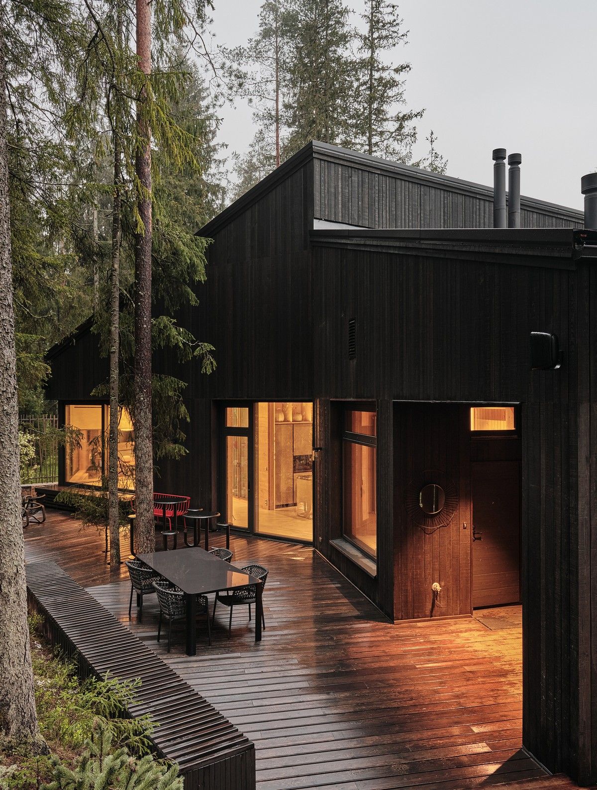 Архитектурная концепция здания сформирована особенностями рельефа и учитывает все природные ценности местности. Нижний этаж, включающий в себя гараж, гардеробную, винную комнату, кладовую и подсобные помещения, воспринимается как часть холмистого ландшафта. На верхнем этаже расположены основные функциональные пространства - социальная и приватная зоны.При строительстве дома приоритет был отдан местным натуральным материалам, которые способствовали созданию гармонии с окружающим лесом. Так, для облицовки фасадов использованы древесина лиственницы темного цвета и габбро-диабаз, уникальный чёрный камень субвулканической горной породы из Карелии, который не только обеспечивает современный стиль зданию, но и отражает культурную историю региона. Для внутреннего оформления дома выбран натуральный дуб, который используется для отделки стен и потолков. Теплое светлое дерево делает интерьер особенно привлекательным и по-домашнему уютным.В оформлении экстерьера использованы не только элементы современной архитектуры, но и детали, отражающие исторические и культурные традиции региона. Так, деревенский стиль объекту придают раздвижные ставни на окнах, украшенные традиционным русским резным орнаментом. Учитывая, что в оформлении дома доминирует натуральная древесина, на балконе второго этажа предусмотрен подъемный механизм, позволяющий организовать, в случае необходимости, беспрепятственный проезд пожарного автомобиля.Минималистичный интерьер выполнен с доминированием светлой цветовой гаммы, резко контрастирующей с темным экстерьером. Несмотря на то, что в оформлении внутренних пространств используется камень, интерьер смотрится необыкновенно легким и теплым. Кроме того, эффектное сочетание камня и дерева привносит в пространство ощущение природной свежести и выразительности.Социальная зона открытого плана включает в себя гостиную, столовую и кухню. Стеклянные раздвижные двери связывают ее с большой открытой террасой, прекрасно оборудованной для отдыха на природе. Отсюда открывается завораживающий вид на лес и протекающий внизу ручей. Большой разнонаправленный диван позволяет любоваться прекрасными видами на лес с любой стороны. Расположенный рядом камин привносит ощущение особенного уюта и располагает к приятным посиделкам.Прекрасно оборудованная современная кухня впечатляет компактностью. Барные стулья разной высоты идеально подходят для размещения не только взрослых, но и детей. Нотки деревенского стиля привносит в оформление зоны верхний свет, который вместо традиционных светильников использует множество свечей. Элегантно оформлена обеденная зона. Вокруг деревянного круглого стола установлены стулья, обитые бархатом, что придает пространству особенный шарм. Стильно смотрятся пушистые натуральные подвески, которые, подобно облакам, свисают с потолочных ламп.Стеклянные двери во всю высоту помещения связывают социальную зону с приватной, создавая ощущение единого гибкого пространства. Центром внимания спальни является отдельно стоящая каменная ванная с видом на зеленый лес. Над ней, ассоциируясь со звездным балдахином, нависает массивная люстра со множеством огней. Туалетный каменный столик с раковиной также находятся в открытом пространстве. Перфорированные оконные ставни идеально