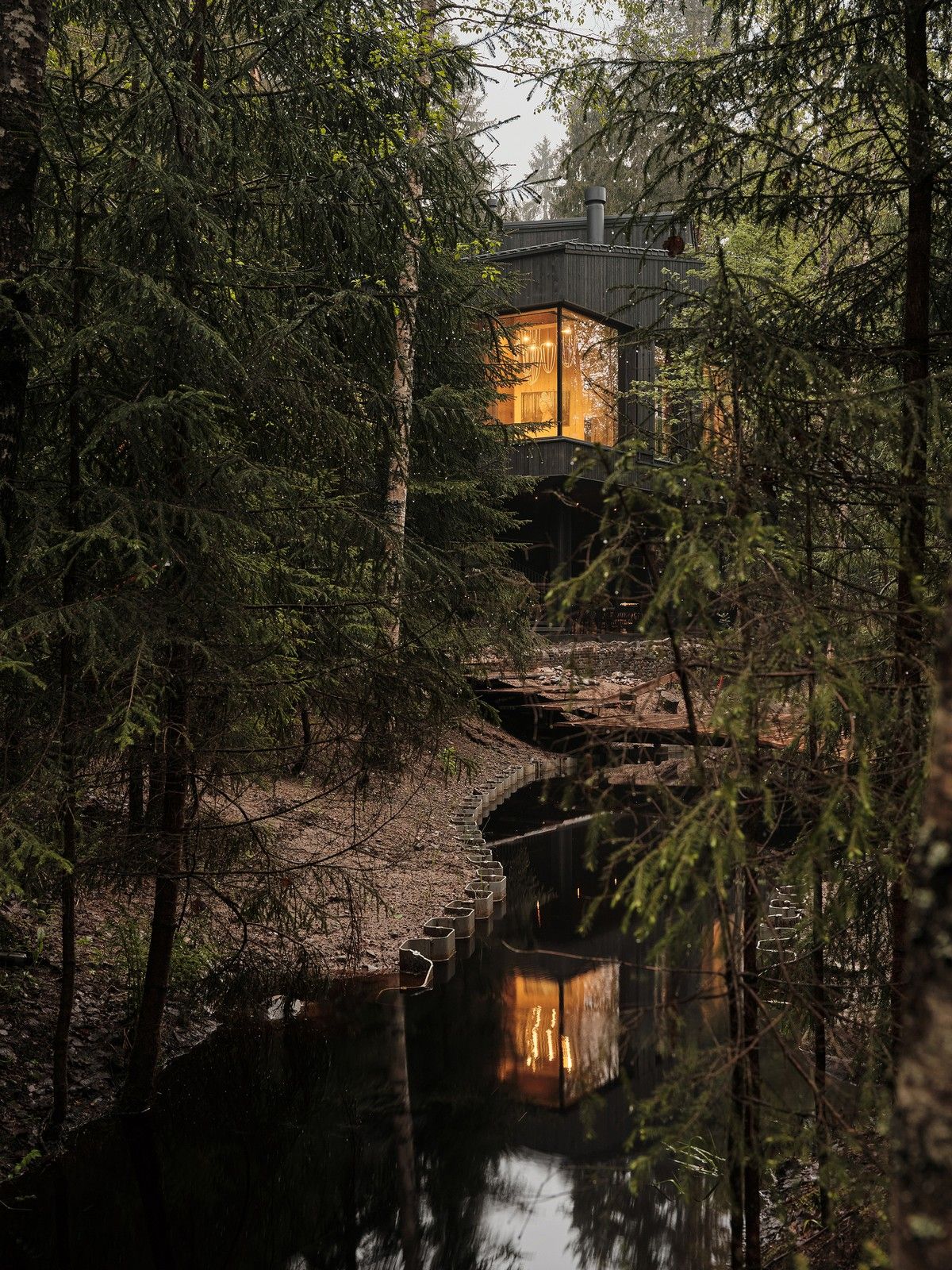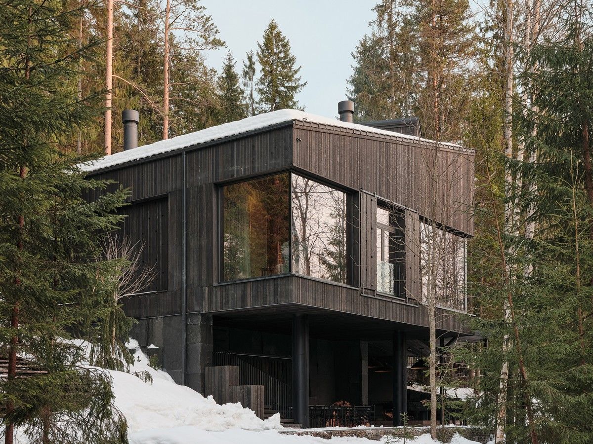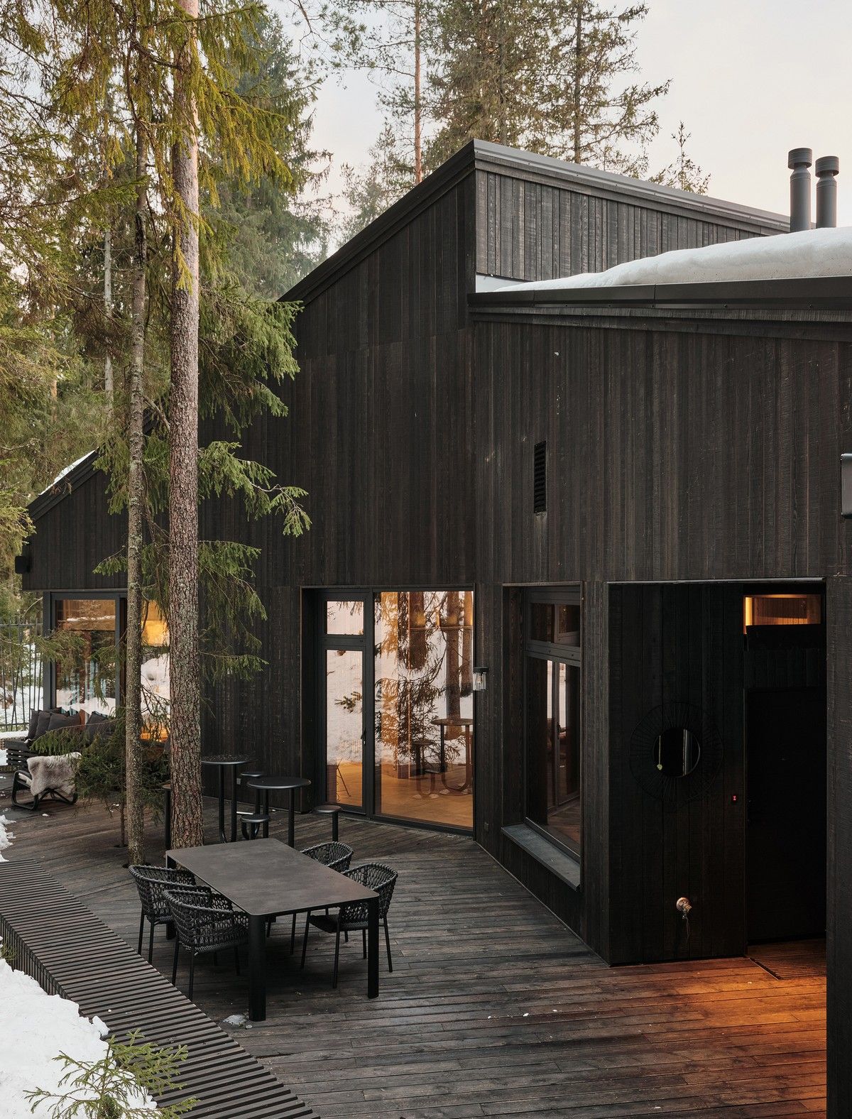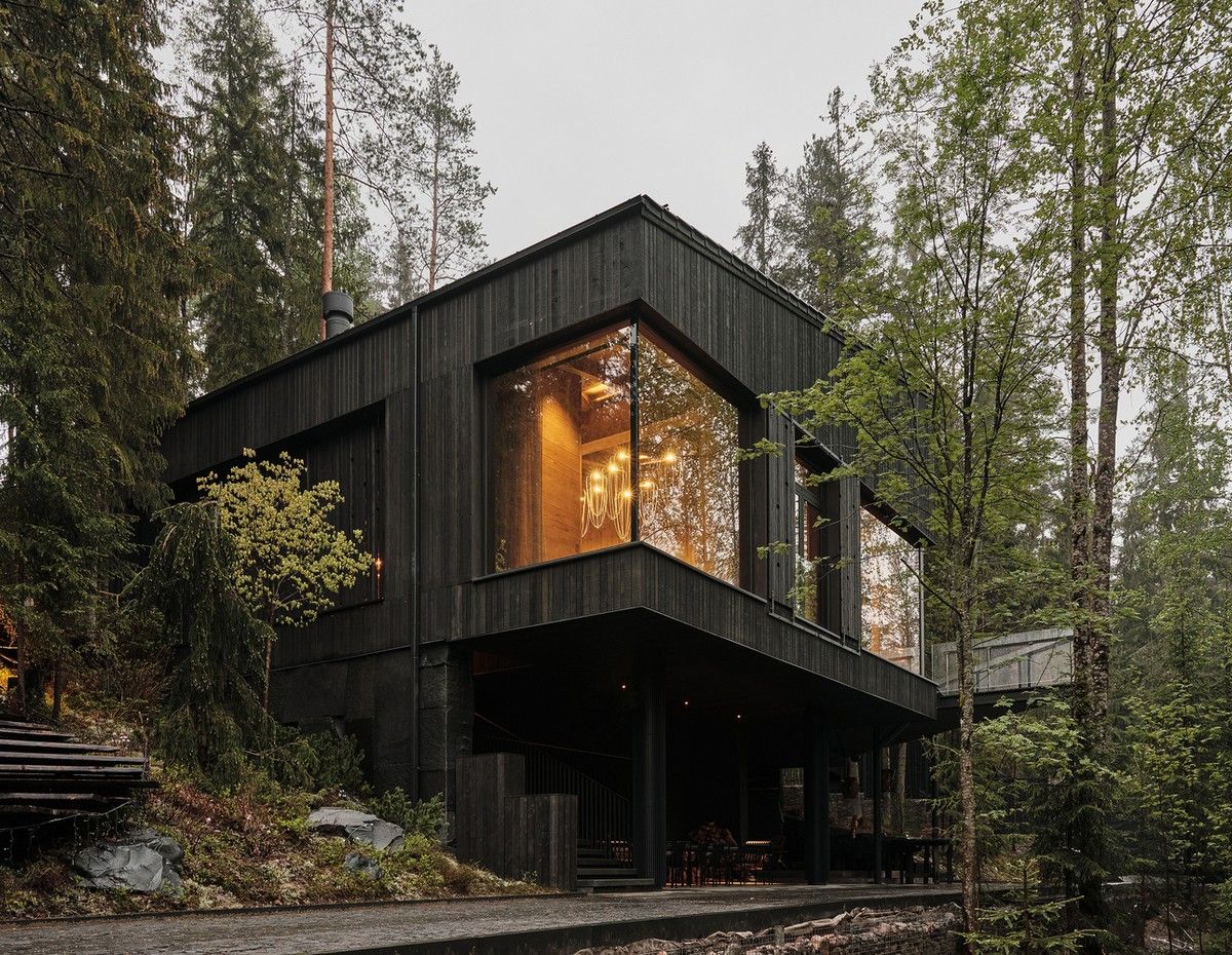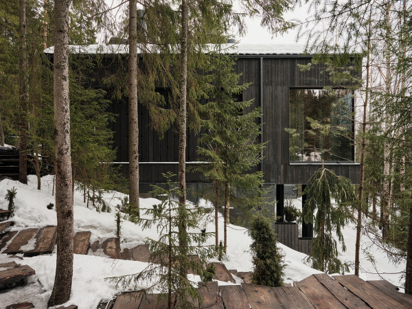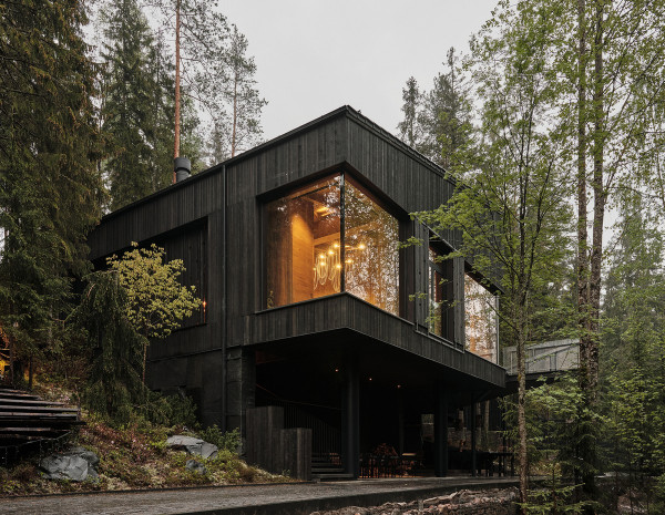 Архитектурная концепция здания сформирована особенностями рельефа и учитывает все природные ценности местности. Нижний этаж, включающий в себя гараж, гардеробную, винную комнату, кладовую и подсобные помещения, воспринимается как часть холмистого ландшафта. На верхнем этаже расположены основные функциональные пространства - социальная и приватная зоны.При строительстве дома приоритет был отдан местным натуральным материалам, которые способствовали созданию гармонии с окружающим лесом. Так, для облицовки фасадов использованы древесина лиственницы темного цвета и габбро-диабаз, уникальный чёрный камень субвулканической горной породы из Карелии, который не только обеспечивает современный стиль зданию, но и отражает культурную историю региона. Для внутреннего оформления дома выбран натуральный дуб, который используется для отделки стен и потолков. Теплое светлое дерево делает интерьер особенно привлекательным и по-домашнему уютным.В оформлении экстерьера использованы не только элементы современной архитектуры, но и детали, отражающие исторические и культурные традиции региона. Так, деревенский стиль объекту придают раздвижные ставни на окнах, украшенные традиционным русским резным орнаментом. Учитывая, что в оформлении дома доминирует натуральная древесина, на балконе второго этажа предусмотрен подъемный механизм, позволяющий организовать, в случае необходимости, беспрепятственный проезд пожарного автомобиля.Минималистичный интерьер выполнен с доминированием светлой цветовой гаммы, резко контрастирующей с темным экстерьером. Несмотря на то, что в оформлении внутренних пространств используется камень, интерьер смотрится необыкновенно легким и теплым. Кроме того, эффектное сочетание камня и дерева привносит в пространство ощущение природной свежести и выразительности.Социальная зона открытого плана включает в себя гостиную, столовую и кухню. Стеклянные раздвижные двери связывают ее с большой открытой террасой, прекрасно оборудованной для отдыха на природе. Отсюда открывается завораживающий вид на лес и протекающий внизу ручей. Большой разнонаправленный диван позволяет любоваться прекрасными видами на лес с любой стороны. Расположенный рядом камин привносит ощущение особенного уюта и располагает к приятным посиделкам.Прекрасно оборудованная современная кухня впечатляет компактностью. Барные стулья разной высоты идеально подходят для размещения не только взрослых, но и детей. Нотки деревенского стиля привносит в оформление зоны верхний свет, который вместо традиционных светильников использует множество свечей. Элегантно оформлена обеденная зона. Вокруг деревянного круглого стола установлены стулья, обитые бархатом, что придает пространству особенный шарм. Стильно смотрятся пушистые натуральные подвески, которые, подобно облакам, свисают с потолочных ламп.Стеклянные двери во всю высоту помещения связывают социальную зону с приватной, создавая ощущение единого гибкого пространства. Центром внимания спальни является отдельно стоящая каменная ванная с видом на зеленый лес. Над ней, ассоциируясь со звездным балдахином, нависает массивная люстра со множеством огней. Туалетный каменный столик с раковиной также находятся в открытом пространстве. Перфорированные оконные ставни идеально