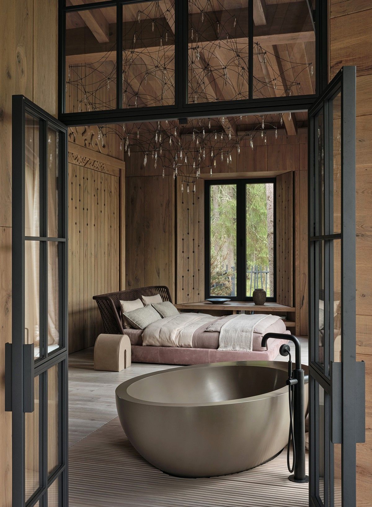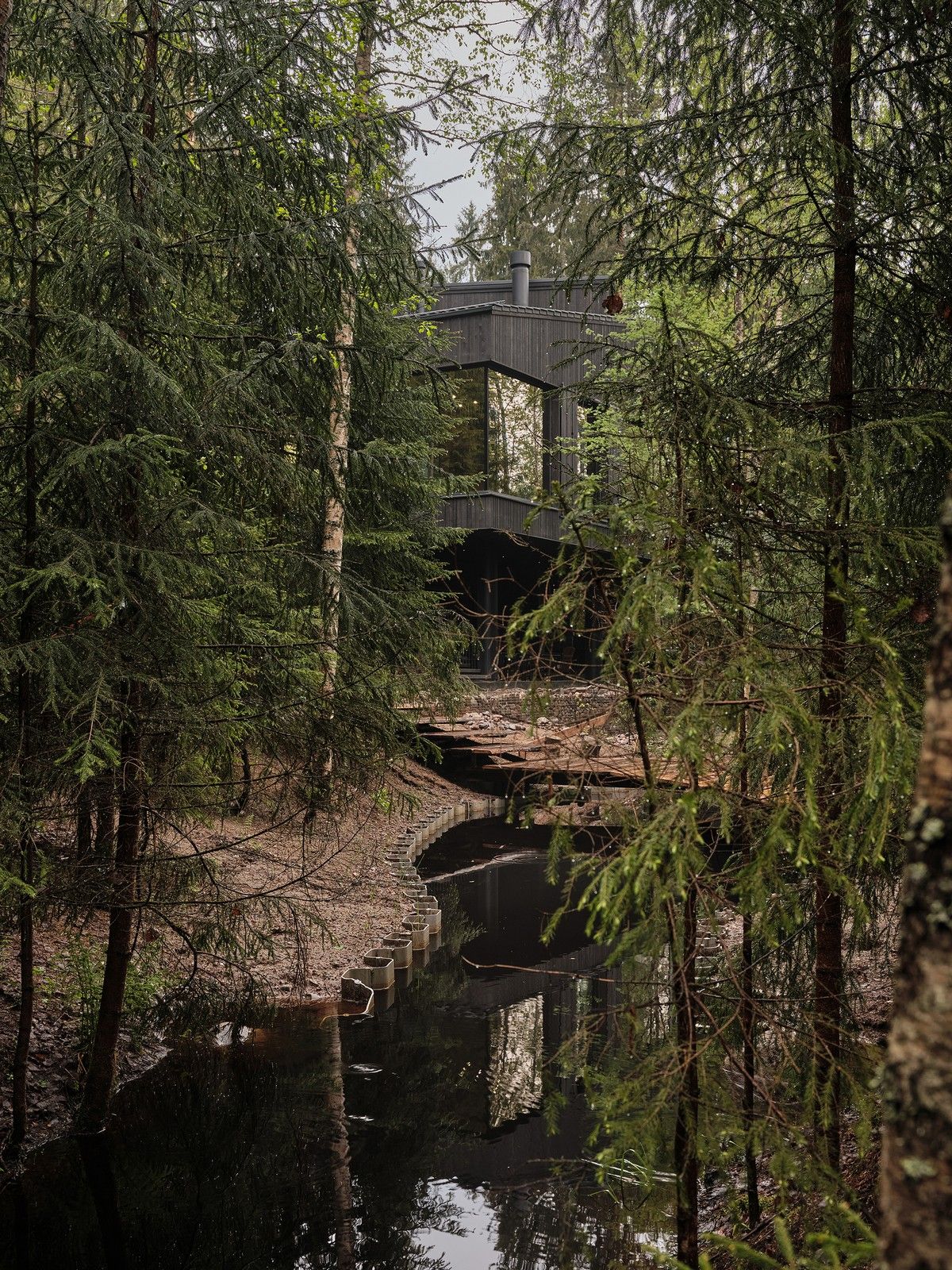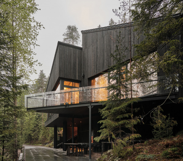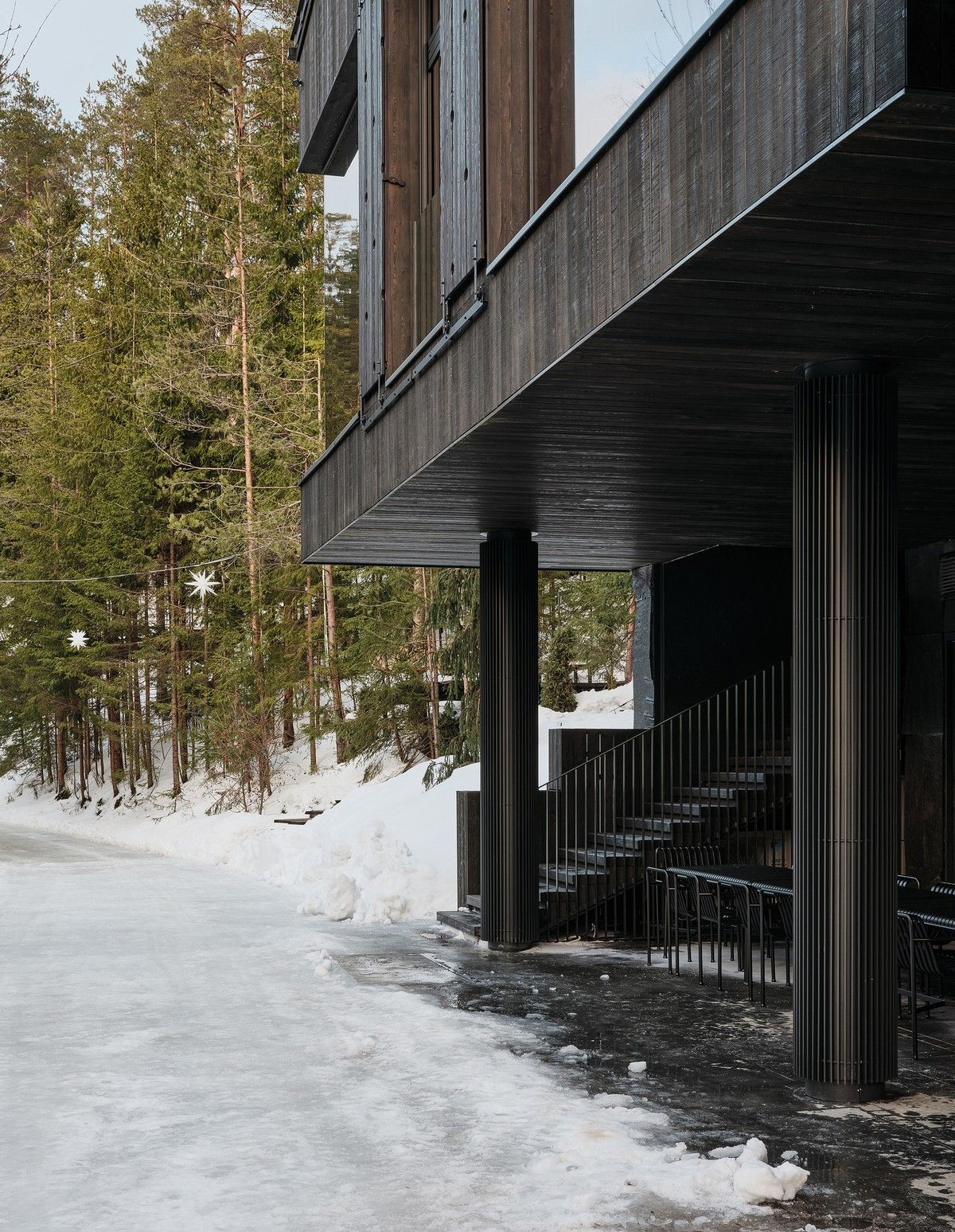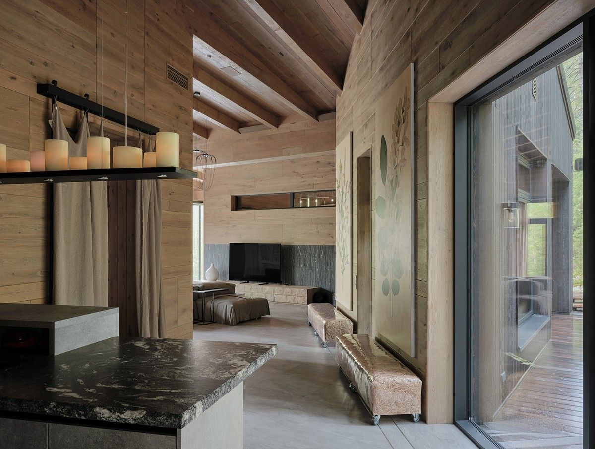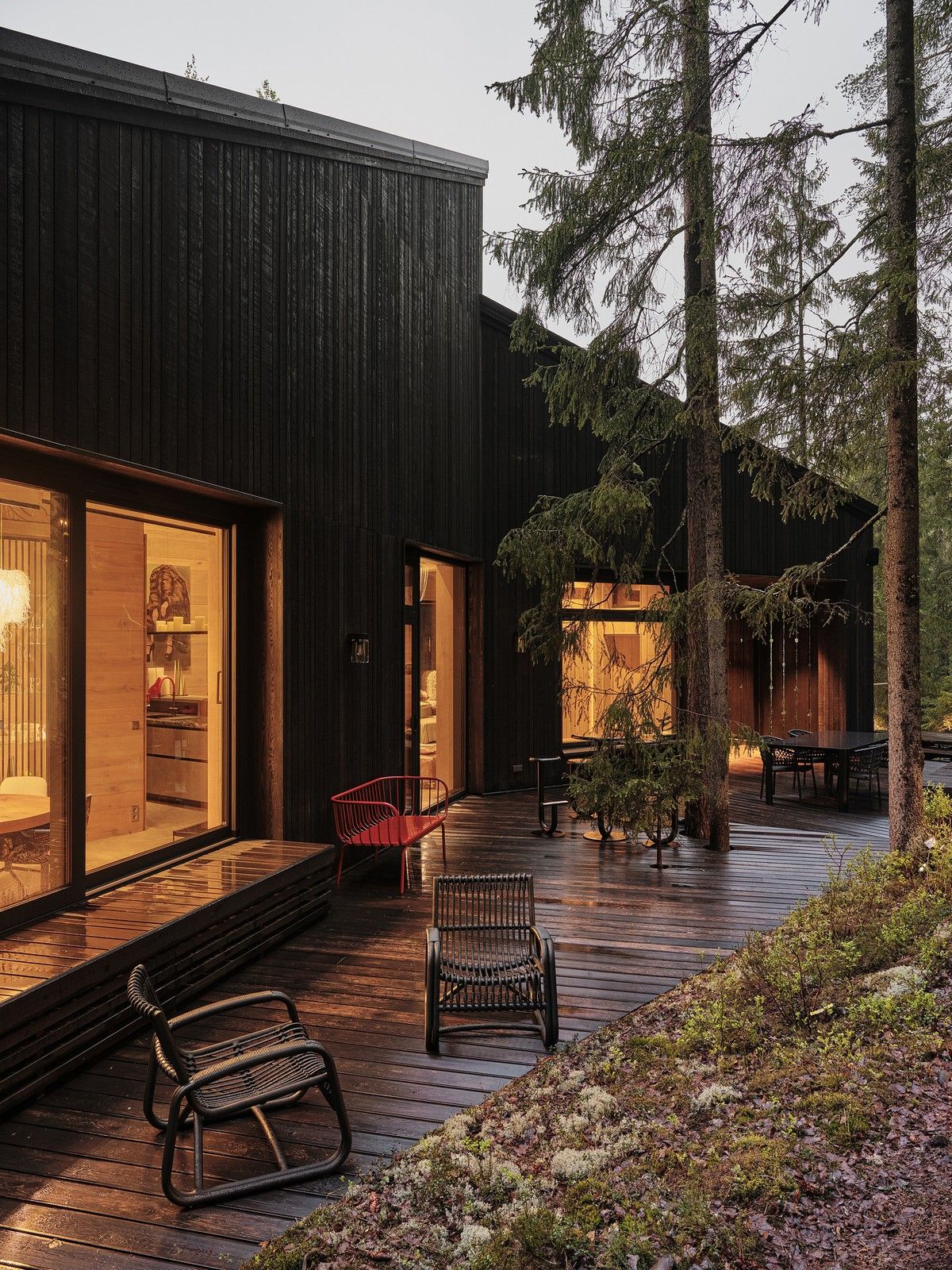 Архитектурная концепция здания сформирована особенностями рельефа и учитывает все природные ценности местности. Нижний этаж, включающий в себя гараж, гардеробную, винную комнату, кладовую и подсобные помещения, воспринимается как часть холмистого ландшафта. На верхнем этаже расположены основные функциональные пространства - социальная и приватная зоны.При строительстве дома приоритет был отдан местным натуральным материалам, которые способствовали созданию гармонии с окружающим лесом. Так, для облицовки фасадов использованы древесина лиственницы темного цвета и габбро-диабаз, уникальный чёрный камень субвулканической горной породы из Карелии, который не только обеспечивает современный стиль зданию, но и отражает культурную историю региона. Для внутреннего оформления дома выбран натуральный дуб, который используется для отделки стен и потолков. Теплое светлое дерево делает интерьер особенно привлекательным и по-домашнему уютным.В оформлении экстерьера использованы не только элементы современной архитектуры, но и детали, отражающие исторические и культурные традиции региона. Так, деревенский стиль объекту придают раздвижные ставни на окнах, украшенные традиционным русским резным орнаментом. Учитывая, что в оформлении дома доминирует натуральная древесина, на балконе второго этажа предусмотрен подъемный механизм, позволяющий организовать, в случае необходимости, беспрепятственный проезд пожарного автомобиля.Минималистичный интерьер выполнен с доминированием светлой цветовой гаммы, резко контрастирующей с темным экстерьером. Несмотря на то, что в оформлении внутренних пространств используется камень, интерьер смотрится необыкновенно легким и теплым. Кроме того, эффектное сочетание камня и дерева привносит в пространство ощущение природной свежести и выразительности.Социальная зона открытого плана включает в себя гостиную, столовую и кухню. Стеклянные раздвижные двери связывают ее с большой открытой террасой, прекрасно оборудованной для отдыха на природе. Отсюда открывается завораживающий вид на лес и протекающий внизу ручей. Большой разнонаправленный диван позволяет любоваться прекрасными видами на лес с любой стороны. Расположенный рядом камин привносит ощущение особенного уюта и располагает к приятным посиделкам.Прекрасно оборудованная современная кухня впечатляет компактностью. Барные стулья разной высоты идеально подходят для размещения не только взрослых, но и детей. Нотки деревенского стиля привносит в оформление зоны верхний свет, который вместо традиционных светильников использует множество свечей. Элегантно оформлена обеденная зона. Вокруг деревянного круглого стола установлены стулья, обитые бархатом, что придает пространству особенный шарм. Стильно смотрятся пушистые натуральные подвески, которые, подобно облакам, свисают с потолочных ламп.Стеклянные двери во всю высоту помещения связывают социальную зону с приватной, создавая ощущение единого гибкого пространства. Центром внимания спальни является отдельно стоящая каменная ванная с видом на зеленый лес. Над ней, ассоциируясь со звездным балдахином, нависает массивная люстра со множеством огней. Туалетный каменный столик с раковиной также находятся в открытом пространстве. Перфорированные оконные ставни идеально