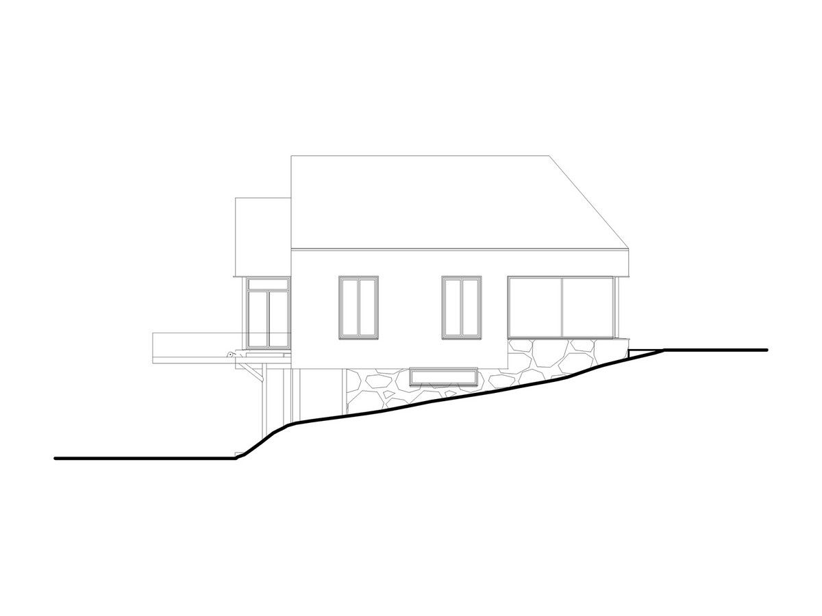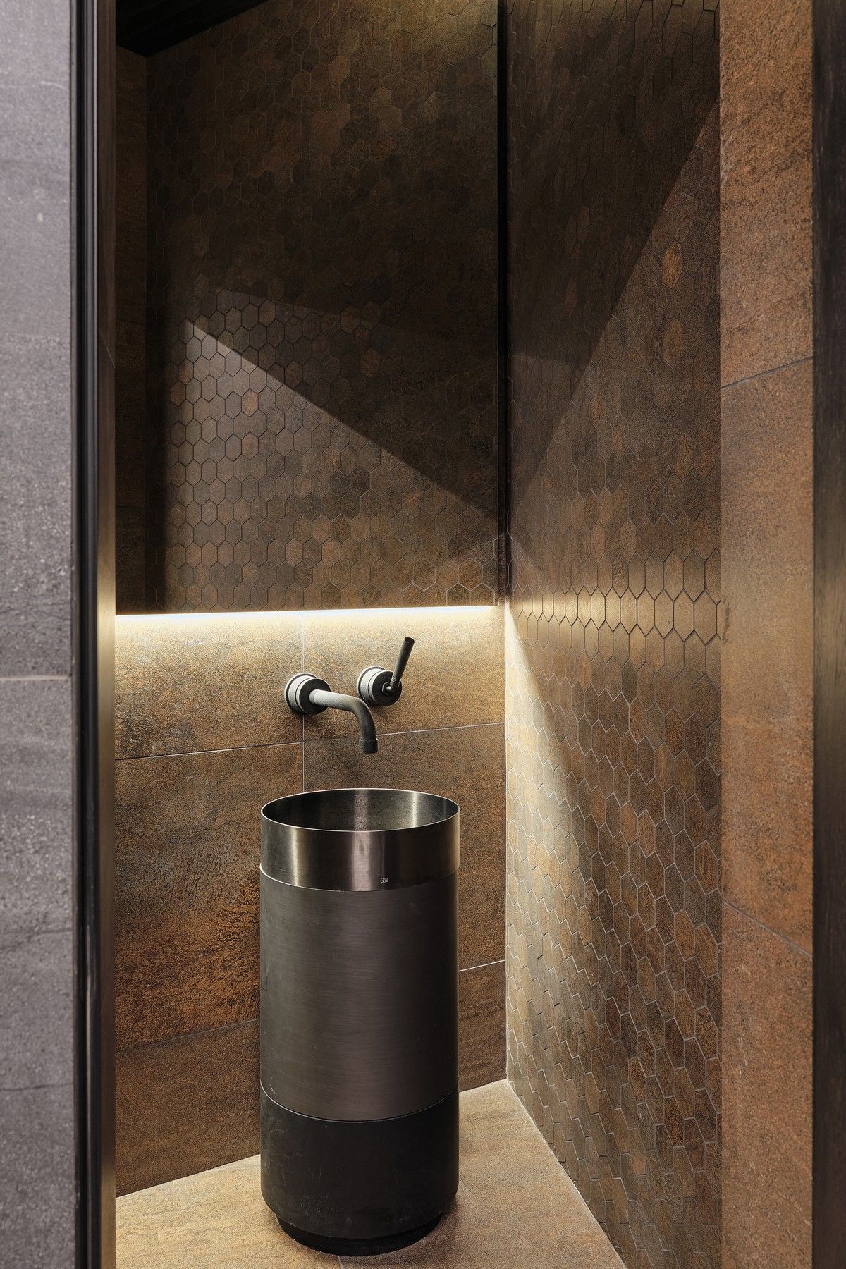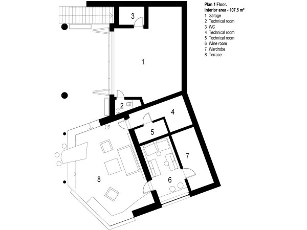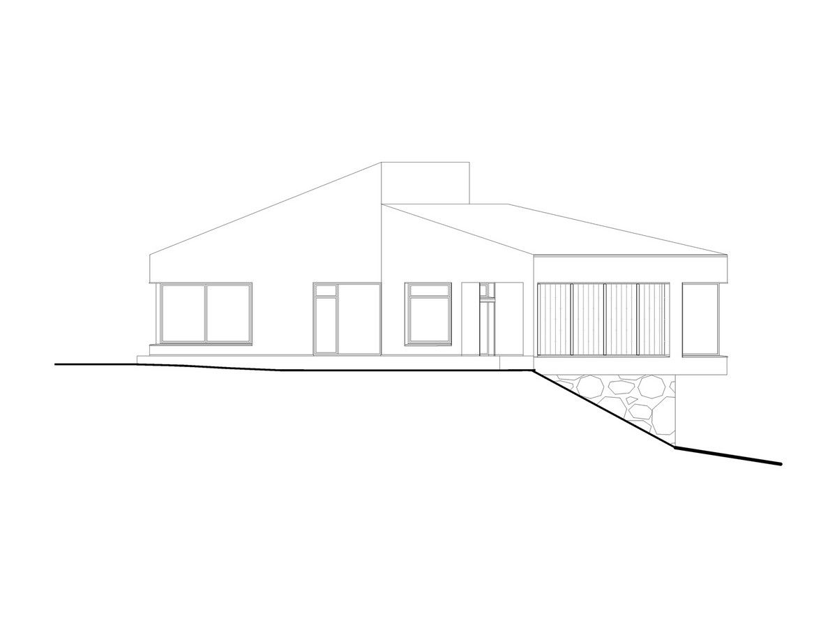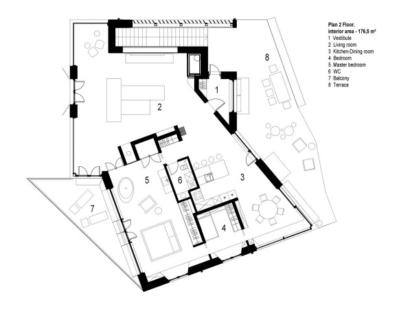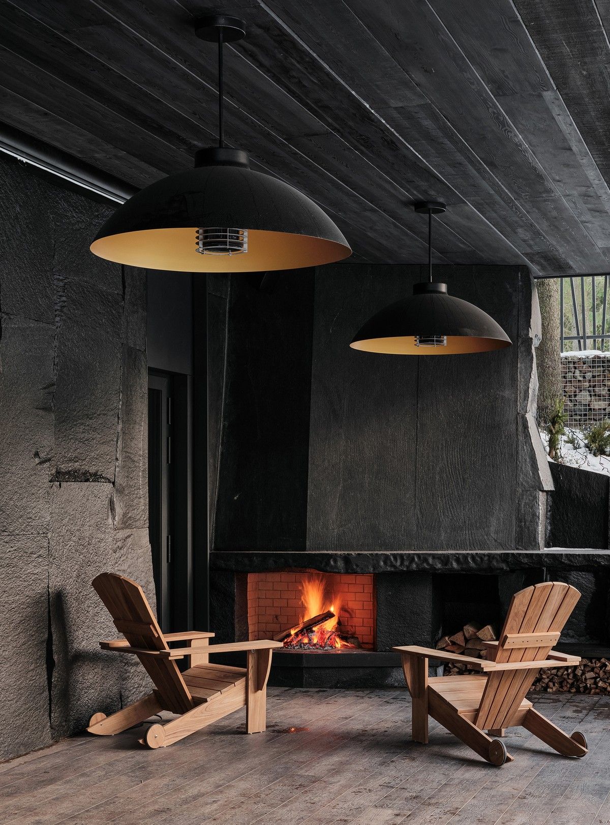 Архитектурная концепция здания сформирована особенностями рельефа и учитывает все природные ценности местности. Нижний этаж, включающий в себя гараж, гардеробную, винную комнату, кладовую и подсобные помещения, воспринимается как часть холмистого ландшафта. На верхнем этаже расположены основные функциональные пространства - социальная и приватная зоны.При строительстве дома приоритет был отдан местным натуральным материалам, которые способствовали созданию гармонии с окружающим лесом. Так, для облицовки фасадов использованы древесина лиственницы темного цвета и габбро-диабаз, уникальный чёрный камень субвулканической горной породы из Карелии, который не только обеспечивает современный стиль зданию, но и отражает культурную историю региона. Для внутреннего оформления дома выбран натуральный дуб, который используется для отделки стен и потолков. Теплое светлое дерево делает интерьер особенно привлекательным и по-домашнему уютным.В оформлении экстерьера использованы не только элементы современной архитектуры, но и детали, отражающие исторические и культурные традиции региона. Так, деревенский стиль объекту придают раздвижные ставни на окнах, украшенные традиционным русским резным орнаментом. Учитывая, что в оформлении дома доминирует натуральная древесина, на балконе второго этажа предусмотрен подъемный механизм, позволяющий организовать, в случае необходимости, беспрепятственный проезд пожарного автомобиля.Минималистичный интерьер выполнен с доминированием светлой цветовой гаммы, резко контрастирующей с темным экстерьером. Несмотря на то, что в оформлении внутренних пространств используется камень, интерьер смотрится необыкновенно легким и теплым. Кроме того, эффектное сочетание камня и дерева привносит в пространство ощущение природной свежести и выразительности.Социальная зона открытого плана включает в себя гостиную, столовую и кухню. Стеклянные раздвижные двери связывают ее с большой открытой террасой, прекрасно оборудованной для отдыха на природе. Отсюда открывается завораживающий вид на лес и протекающий внизу ручей. Большой разнонаправленный диван позволяет любоваться прекрасными видами на лес с любой стороны. Расположенный рядом камин привносит ощущение особенного уюта и располагает к приятным посиделкам.Прекрасно оборудованная современная кухня впечатляет компактностью. Барные стулья разной высоты идеально подходят для размещения не только взрослых, но и детей. Нотки деревенского стиля привносит в оформление зоны верхний свет, который вместо традиционных светильников использует множество свечей. Элегантно оформлена обеденная зона. Вокруг деревянного круглого стола установлены стулья, обитые бархатом, что придает пространству особенный шарм. Стильно смотрятся пушистые натуральные подвески, которые, подобно облакам, свисают с потолочных ламп.Стеклянные двери во всю высоту помещения связывают социальную зону с приватной, создавая ощущение единого гибкого пространства. Центром внимания спальни является отдельно стоящая каменная ванная с видом на зеленый лес. Над ней, ассоциируясь со звездным балдахином, нависает массивная люстра со множеством огней. Туалетный каменный столик с раковиной также находятся в открытом пространстве. Перфорированные оконные ставни идеально
