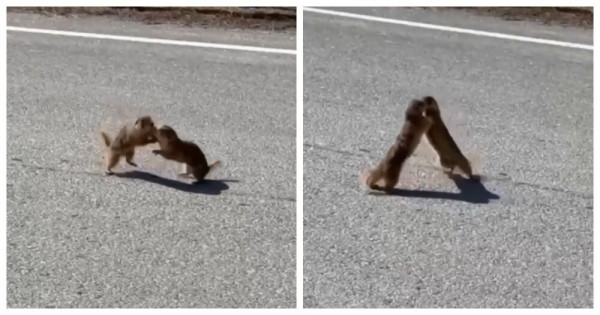 Подобным образом суслики обычно делят самку, еду или территорию.Бой животных продолжался несмотря на громкие звуковые сигналы автомобиля и проезжающие машины.