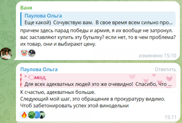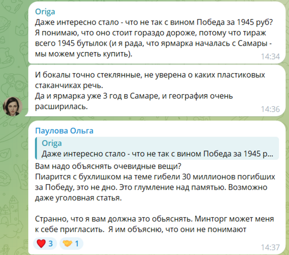 И активистка написала гневный пост:Простите, но сейчас будет мат. Вы совсем ох***и, товарищи производители вина? Серьёзно, вино Победа за 1945 ₽?Минторг в лице Дениса Гуркова задам вам один вопрос: Вы вообще все риски рассчитали и проверили ассортимент платной винной ярмарки в центре Старой Самары за бюджет региона в Страстную пятницу и с вином Победа за 1945₽?Я думаю, что всю эту вакханалию с пластиковыми стаканчиками, вином и сыром с пластика надо быстро закрыть. Это дно, а не ярмарка успеха.