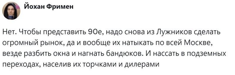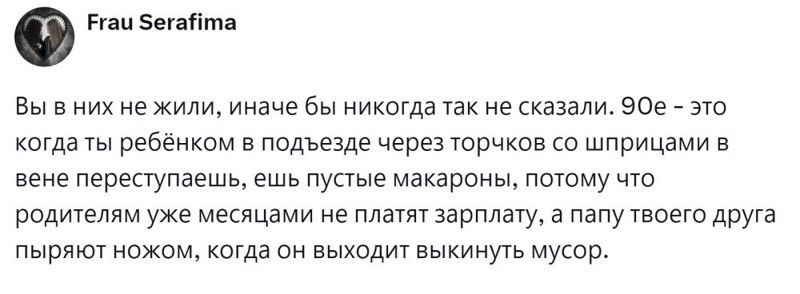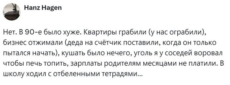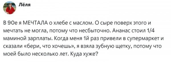 Для одних это десятилетие ассоциируется с головокружительной свободой, первыми шагами в рыночную экономику и безудержным оптимизмом. Для других с экономическими кризисами, нестабильностью, разрушением привычного уклада жизни, голодом и отсутствием перспектив. Что же делает 90-е одновременно притягательными и противоречивыми? Пользователи вспомнили яркие моменты и сложные испытания этой эпохи, оставившей этот период в памяти целого поколения.