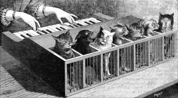 Подобный инструмент в реальности никто никогда не видел, но он описывается в некоторых произведениях 19 века, а также там имеются иллюстрации, на которых изображено Кошачье фортепиано.Описание данного инструмента принадлежит немецкому ученому Афанасию Кирхеру. По этому описанию инструмент состоит из средней длины цепи в 10-12 кошек, которые крепко зафиксированы в дном положении, а их хвосты крепко связаны с клавиатурой пианино.Животные подбираются по высоту тона звуков, которые они могут издавать. При нажатии клавиш животное ощущает сильную боль и начинает кричать.Наверное, название пианино или фортепиано не совсем верное, ведь в 1657 году, когда была опубликована книга, этих инструментов еще не существовало.top10a.ru