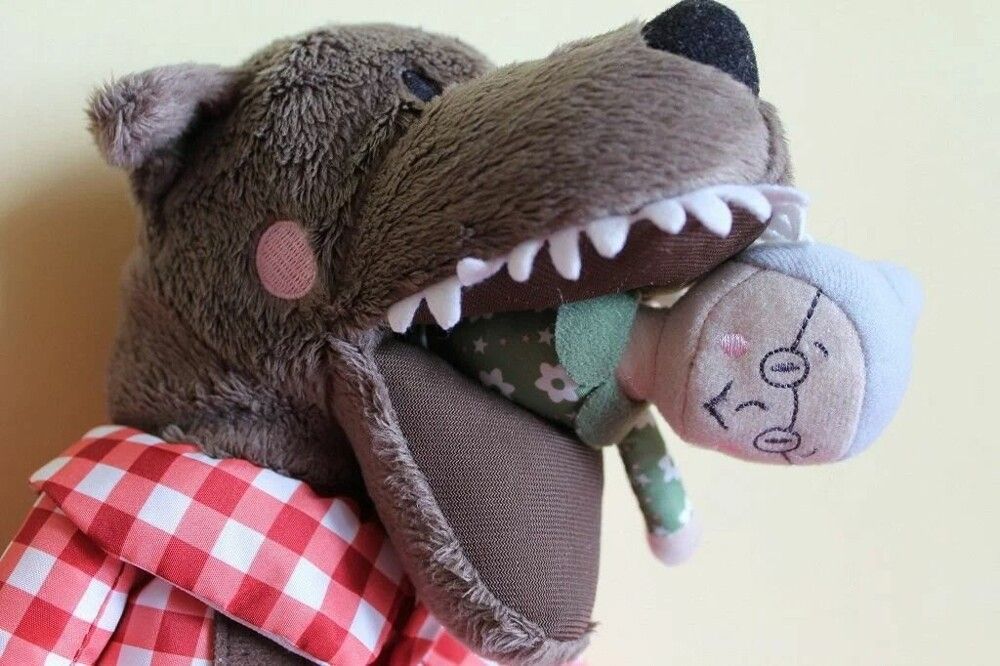 Это волк из сказки "Красная шапочка", момент, когда он съедает бабушку, воплощен в очаровательной плюшевой игрушке, хотя некоторым поколениям эта сцена казалась пугающей.