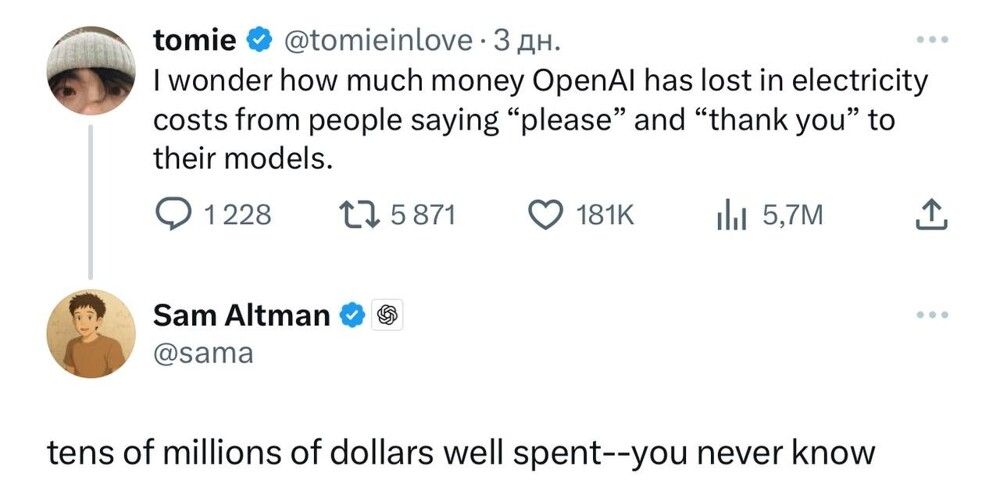 Вот только самой компании такая доброта со стороны пользователей обходится в копеечку. Каждое "спасибо" и "пожалуйста", адресованные ChatGPT, нагружают дата-центры, которые потребляют огромное количество электроэнергии - буквально на миллионы долларов.