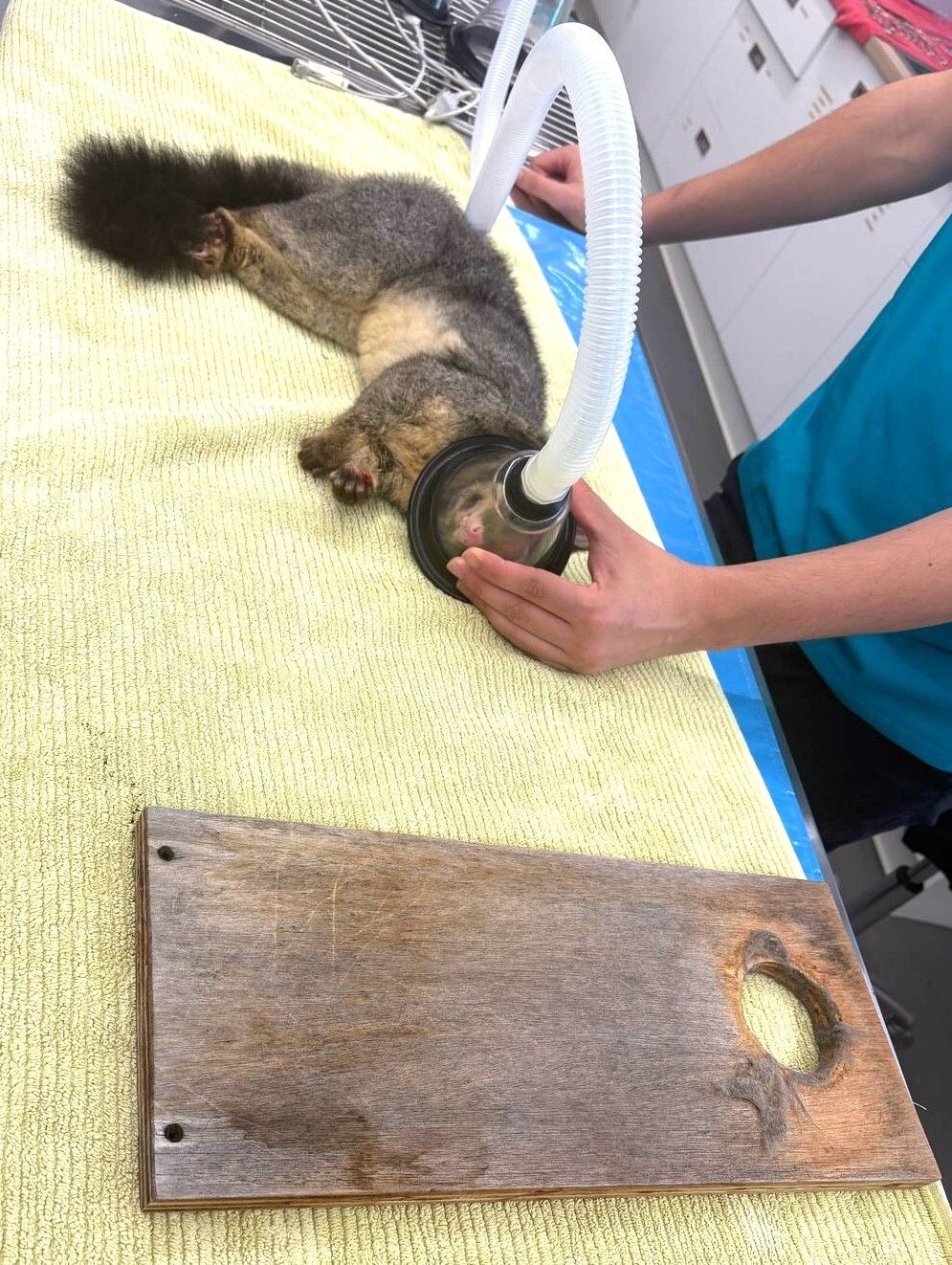 Правда, спасателям пришлось усыпить раздражённого пленника, чтобы он не дёргался и не мешал вызволять его из куска дерева. Вскоре поссум очнулся от наркоза в ветеринарной клинике и наверняка был рад тому, что несносный скворечник остался в прошлом.
