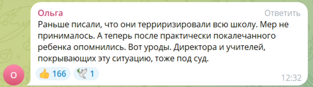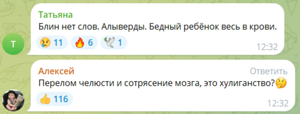 Избиение прокомментировал и глава комитета Госдумы по труду, социальной политике и делам ветеранов Ярослав Нилов. Он тоже предложил наказать агрессоров по всей строгости закона, а потом сразу выслать из страны.Просто обнаглевшие. Самое основное - они могут не понести должного наказания, потому что еще не достигли возраста привлечения к ответственности, все зависит от того, какую статью и пункт применят. Нужно проверить легальность пребывания в России их родителей. Они должны компенсировать весь ущерб, понести максимально возможную ответственность. А дальше вышвырнуть к чертовой матери за пределы России с широким освещением в назидание другим иностранцам, кто будет прикасаться к нашим российским детям.