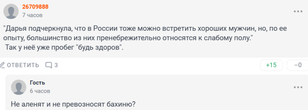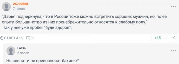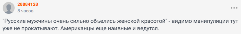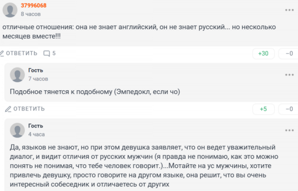 Давайте будем объективными, русские мужчины действительно очень травмированы. Даже у очень обеспеченных много загонов. Это первый мужчина другой нации, с кем я встречаюсь и с кем я объявила свои отношения официально в социальных сетях. Он умеет вести уважительный диалог - это то, что меня привлекло. Почему большинство русских девушек очень любят другие страны? Потому что это действительно другое отношение, тебя ценят по-другому.Русские мужчины очень сильно объелись женской красотой. У нас очень красивые девушки, очень развитые и безумно харизматичные. Я очень уважаю русских женщин.Блогерше американец очень нравится: она считает, что вот он - умеет любить. А наши - якобы обесценивают спутниц жизни, поэтому они её не интересуют.Есть вариант, что они какое-то время очень хорошо могут тебя обхаживать, но в итоге переизбыток женского внимания приводит к тому, что они тебя могут очень сильно обесценить. Здесь я вижу, что мой американский мужчина ко мне относится очень трепетно, он работает над тем, чтобы закрывать мои потребности, а не вынуждает меня к тому, чтобы я закрывала его. Меня сейчас абсолютно не интересуют русские мужчины. Мой мужчина вне конкуренции.