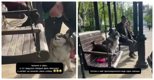 Дедушка каждый день приходит в парк, чтобы покатать своего пёсика на качелях