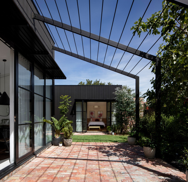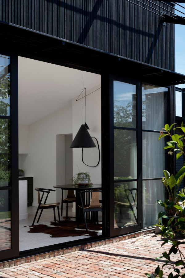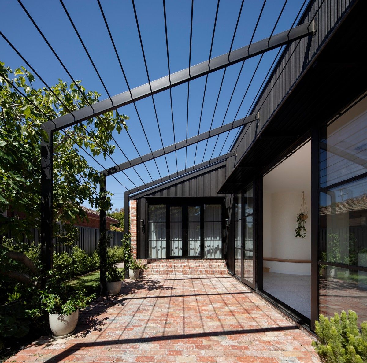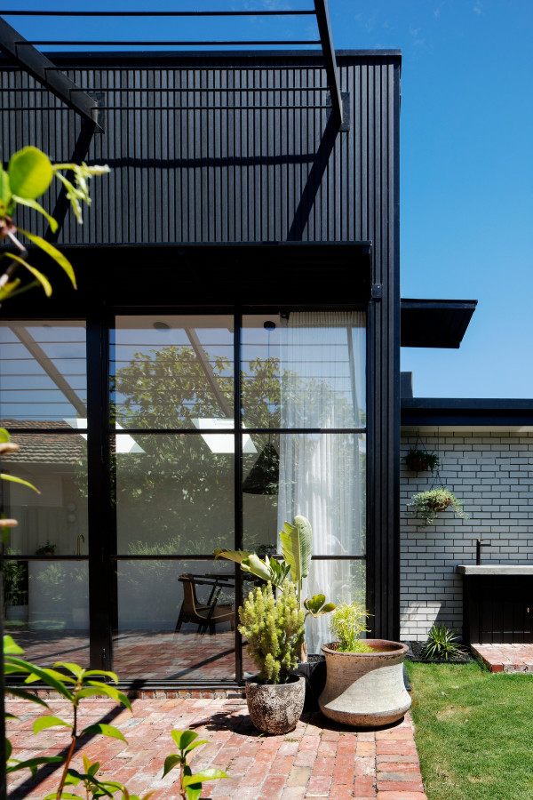 В результате реализации проекта старый дом с темными низкими помещениями, похожий на лабиринт, был отремонтирован и преобразован в современный светлый особняк с пространствами, наполненными свежестью окружающего ландшафта. Приоритетными задачами проекта были определены: достижение высокого уровня естественного освещения во всех помещениях, интеграция пространств с северным садом, а также оборудование изолированного от основного дома гостевого крыла.Поскольку конструкция здания находилась в удовлетворительном состоянии, удалось сохранить большую часть существующей площади, что позволило снизить финансовые затраты. Сэкономить расходы также помогло повторное использование строительных материалов оригинального здания. Так, для кладки стен и брусчатки была использована кирпичная кладка старого дома, а облицовка фасадов выполнена из переработанного пластика. Комфортным и энергоэффективным дом сделала пассивная солнечная ориентация, позволившая уменьшить зависимость от кондиционирования воздуха.На площади 270 квадратных метров были оборудованы все необходимые для комфортной жизни семьи функциональные зоны. Центральное место с панорамным остеклением в сторону сада занимает просторная кухня-столовая. Рядом расположены гостиная и домашний офис. Левое крыло дома занимает гостевая спальня с ванной комнатой. С правой стороны здания находится приватная зона с тремя спальнями и двумя ванными комнатами.Стеклянные раздвижные двери связывают социальное пространство с открытой террасой, защищенной оригинальным "живым" навесом. Вьющиеся растения разрастаются по стальному каркасу и создают естественную зеленую крышу, которая будет защищать помещения, выходящие на север, от яркого солнечного света. Терраса, плавно переходящая на территорию сада, связывает разные функциональные зоны и создает ощущение единой интерьерной композиции, интегрированной с садом.