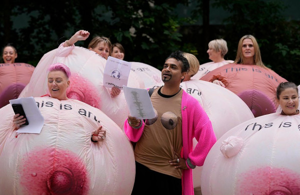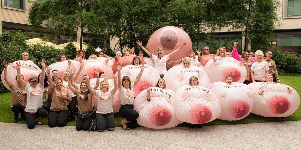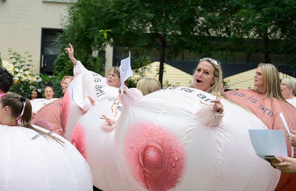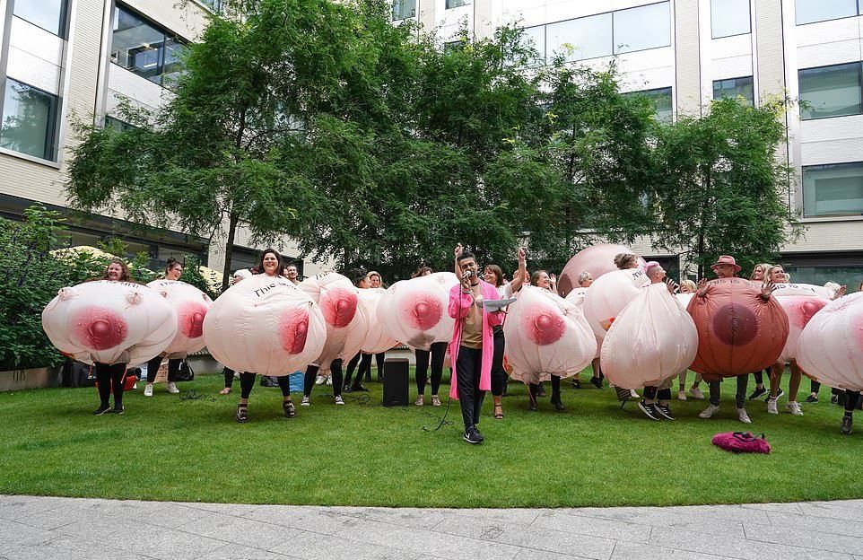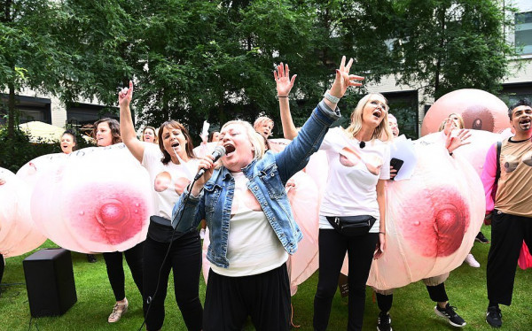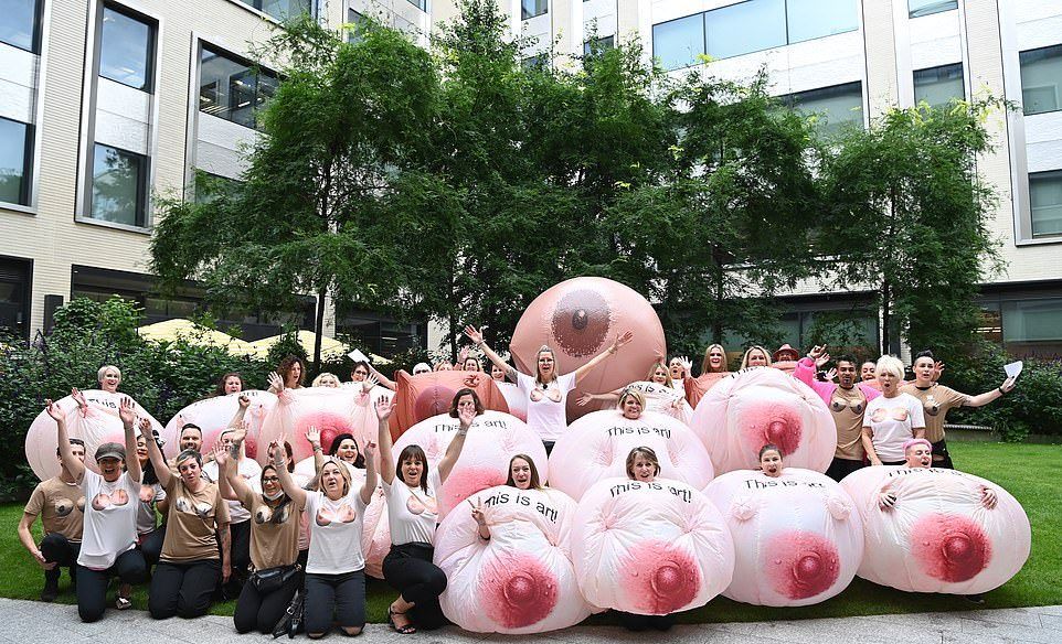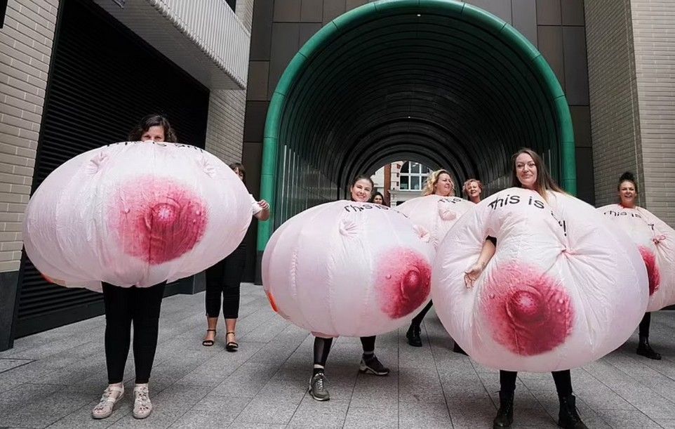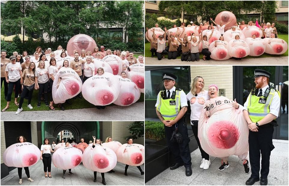Тату-мастера появились у офиса Facebook в центре Лондона, примерив на себя необычные костюмы - издалека могло создаться впечатление, что протестуют огромные надувные груди.Специалистам не нравится, что соцсеть банит посты с перенесшими рак груди женщинами, которые сделали татуировки в виде сосков."Мы делаем все, что в наших силах, чтобы отстаивать наше мнение - и если ради этого приходиться скакать в огромных надувных сиськах, то так тому и быть. Люди не осознают, почему это так важно - люди вроде нас здесь, и пережившие рак груди пациенты должны знать об этом. Некоторые из них не догадываются, что возможно создание реалистичной татуировки в виде сосков", - заявила 47-летняя Вики Мартин, одна из организаторов акции.