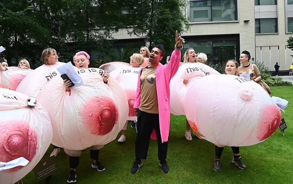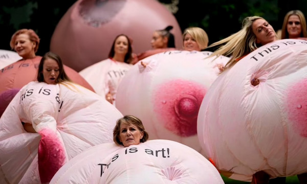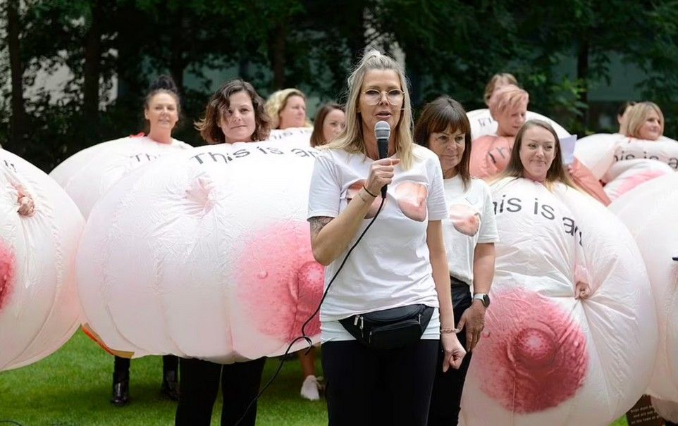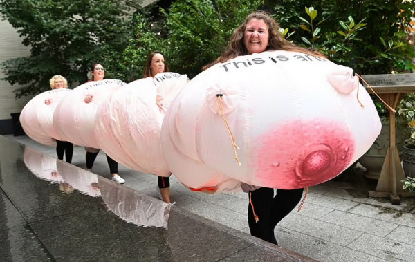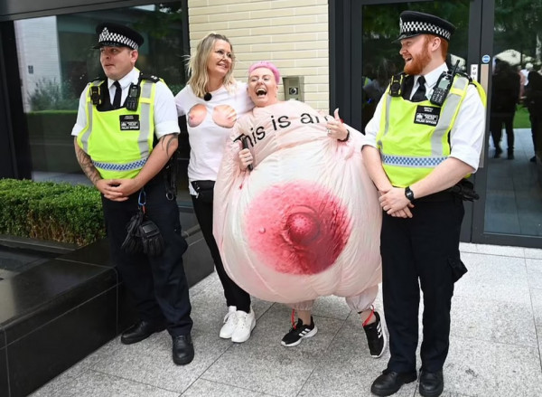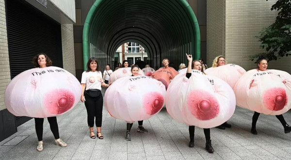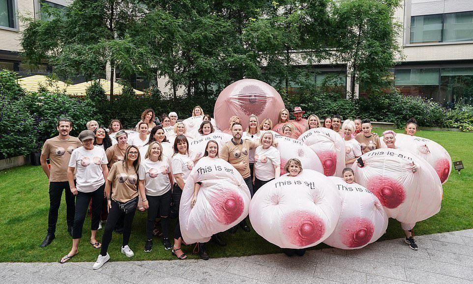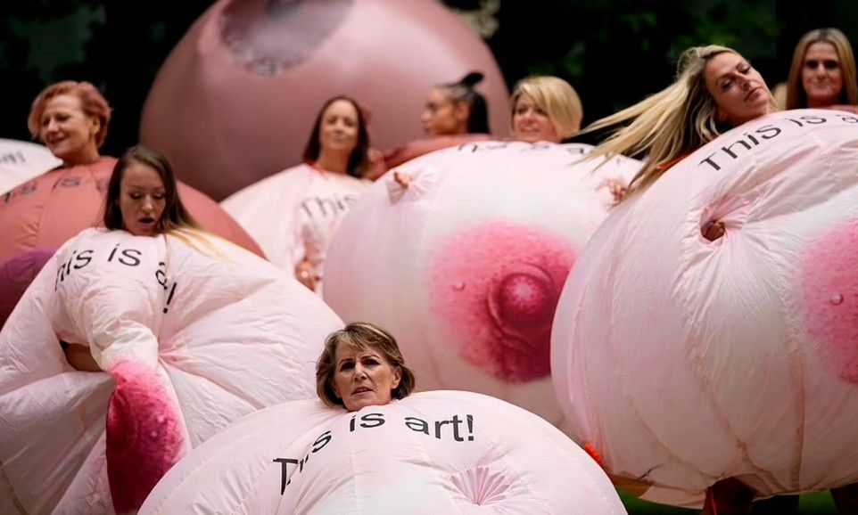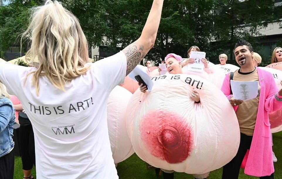 Тату-мастера появились у офиса Facebook в центре Лондона, примерив на себя необычные костюмы - издалека могло создаться впечатление, что протестуют огромные надувные груди.Специалистам не нравится, что соцсеть банит посты с перенесшими рак груди женщинами, которые сделали татуировки в виде сосков."Мы делаем все, что в наших силах, чтобы отстаивать наше мнение - и если ради этого приходиться скакать в огромных надувных сиськах, то так тому и быть. Люди не осознают, почему это так важно - люди вроде нас здесь, и пережившие рак груди пациенты должны знать об этом. Некоторые из них не догадываются, что возможно создание реалистичной татуировки в виде сосков", - заявила 47-летняя Вики Мартин, одна из организаторов акции.