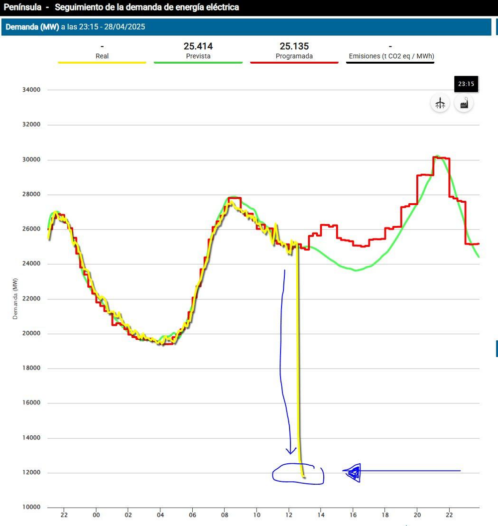 В 12:30 по Мск в большей части Испании вырубилось электричество. Перестали работать светофоры, трамваи остановились, метро тоже не функционирует. Часть поездов застряла прямо в тоннелях, и людям пришлось самостоятельно из них выбираться и пешком идти до станций. Часть аэропортов приостановила вылеты и приём самолётов.Интернет работает лишь с мобильных устройств, и то, лишь за счёт быстрого подключения резервных генераторов. Блэкаут затронул все госучреждения, а в больницах не хватает генераторов для обеспечения нормальной работы и ухода за пациентами.Жилые дома обесточены, а кабинет министров проводит экстренное совещание и пытается разобраться с проблемой.Одной из причин отключения электричества называют какой-то загадочный сбой в энергосистеме Испании. Компания Red Eléctrica управляющая национальной электросетью страны, объявила что уже решает вопрос.Но пока ничего не решила. А потребление электричества в стране за несколько часов упало почти в 2 раза: с 25 184 мегаватт до 12 425.