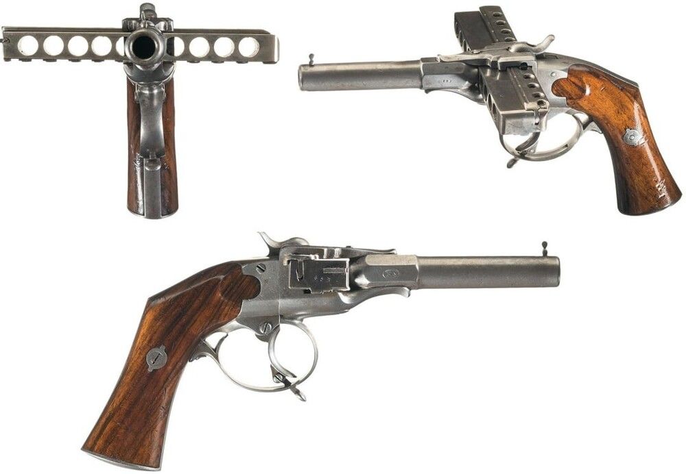 Патроны располагались в длинной металлической пластине. После выстрела стрелок вручную сдвигал пластину, чтобы подвести следующий патрон. Пистолет Jarre 10-Shot Pinfire (1850 г.) позволял сделать 10 выстрелов без перезарядки - прорыв для того времени. Этот дизайн стал предшественником современных магазинных систем, хотя и быстро уступил место револьверам.