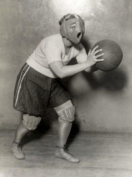 В 1927 году баскетболисты использовали кожаные маски для лица и металлические наколенники - выглядело это как экипировка средневекового турнира, а не спортивная форма. Маска защищала нос и скулы от локтей и мяча, а наколенники с кожаными ремнями - от падений на деревянный паркет без амортизации.