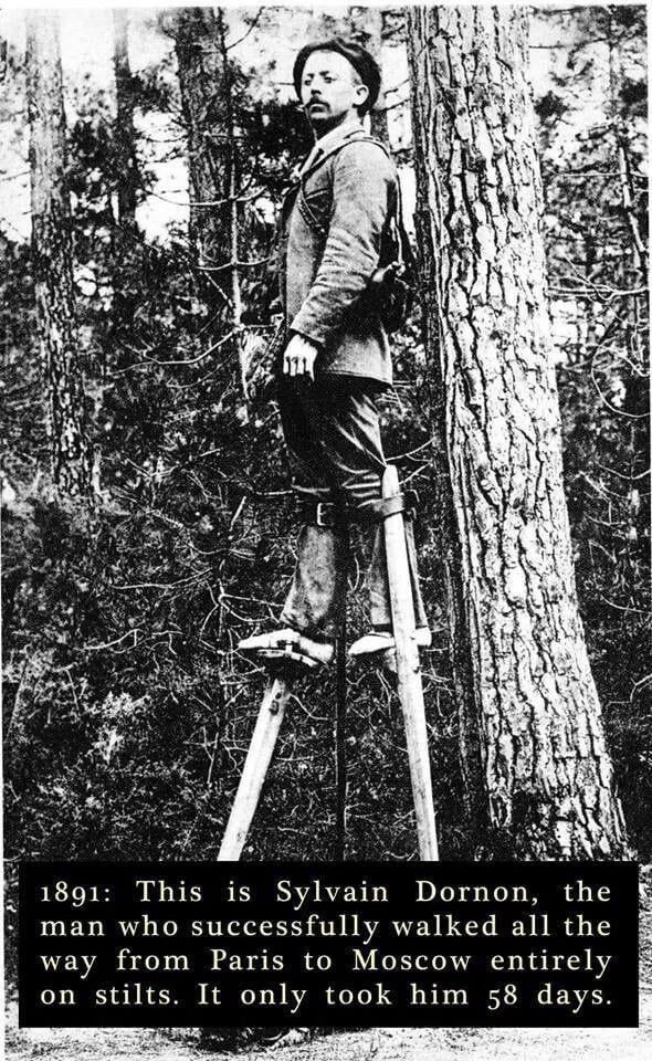 Французский эквилибрист Сильвен Дорнон, который в 1891 году за 58 дней преодолел примерно 3000 километров на 80-сантиметровых ходулях. Его цель - доказать, что это самый быстрый способ передвижения. Он проиграл пари, но вошёл в историю.