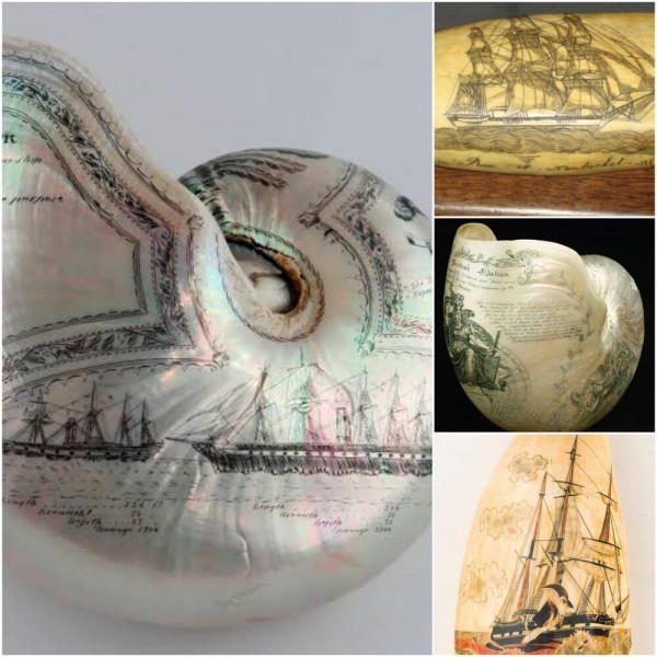 Скримшоу (от англ. scrimshaw) - это искусство гравировки по кости, китовому усу или раковинам, которым моряки занимались в долгих плаваниях. Возникло в XVIII-XIX веках, особенно было распространено среди китобоев.