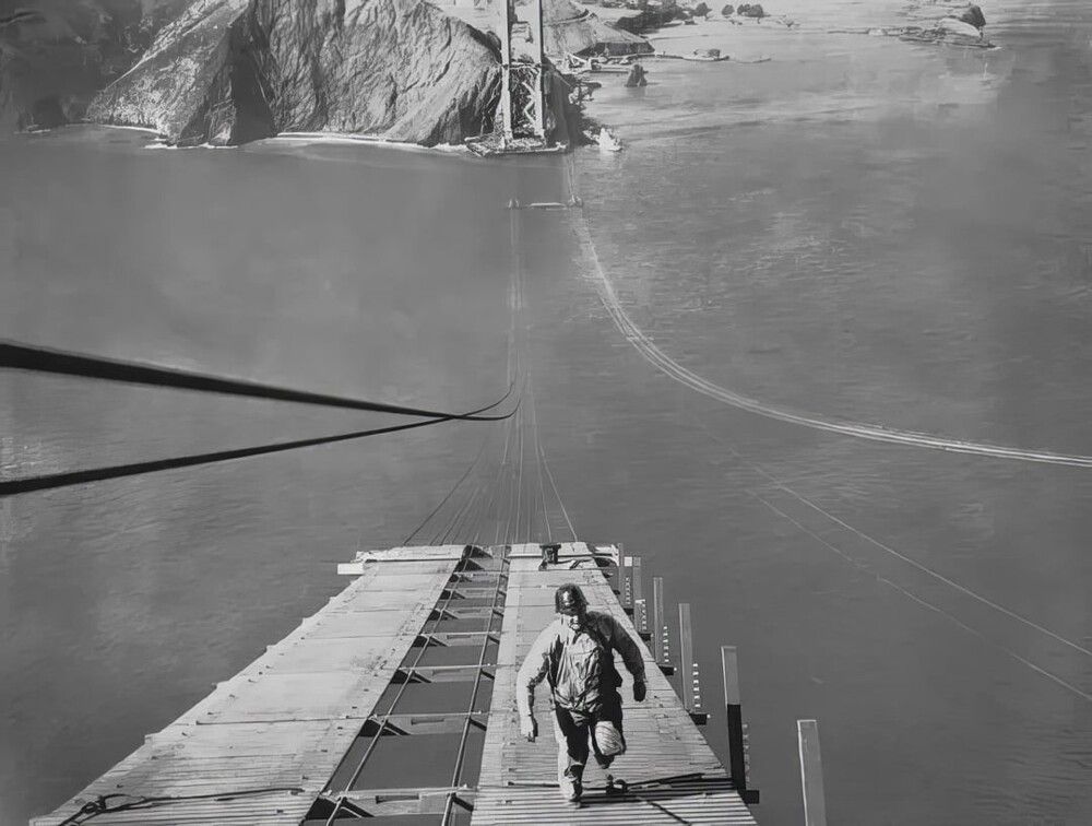 На фотографии запечатлён один из 400 рабочих, участвовавших в плетении главных кабелей моста.