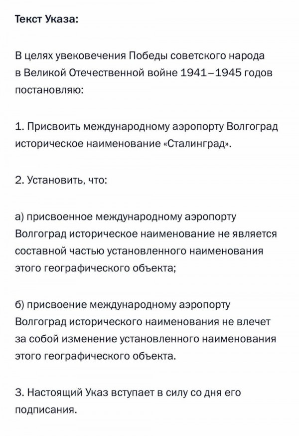 Международному аэропорту Волгограда (Гумрак) официально присвоили историческое название "Сталинград". Соответствующий указ сегодня подписал премьер-министр Михаил Мишустин.Отмечается, что переименовать аэропорт при личной встрече с Путиным предложил губернатор Волгоградской области Андрей Бочаров. Он сообщил президенты, что об этом его попросили ветераны."Все просили меня обратиться к вам, Владимир Владимирович, и поддержать предложение о переименовании аэропорта и дать ему настоящее, гордое, мужественное, героическое название - аэропорт "Сталинград". Прошу поддержать, Владимир Владимирович", - сообщил Бочаров.