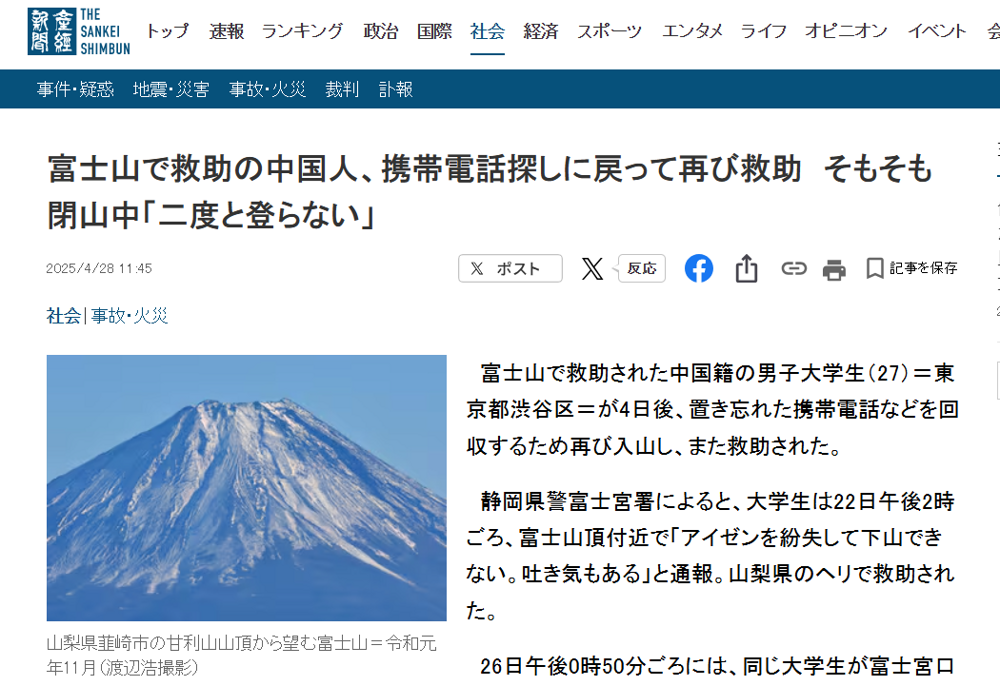 Итак, для понимания сути истории вот вам парочка занимательных фактов про самую знаменитую японскую гору. Эта конусообразная гора считается одной из самых красивых в мире среди действующих вулканов. Да-да, несмотря на то, что последний раз Фудзи плевалась лавой и пеплом более 3 веков назад, она до сих пор находится в списке действующих. Общая высота горы - 3776 метра.Так вот, на высоте 3 км и нашли полумертвого китайца с сильнейшим приступом горной болезни. Проходящие альпинисты вызвали помощь, и пострадавшего эвакуировали вертолетом в больницу. Ситуация, скажем так, обыденная, но вот только этого же самого китайца буквально четыре дня с теми же самыми симптомами спасали с той же высоты.
