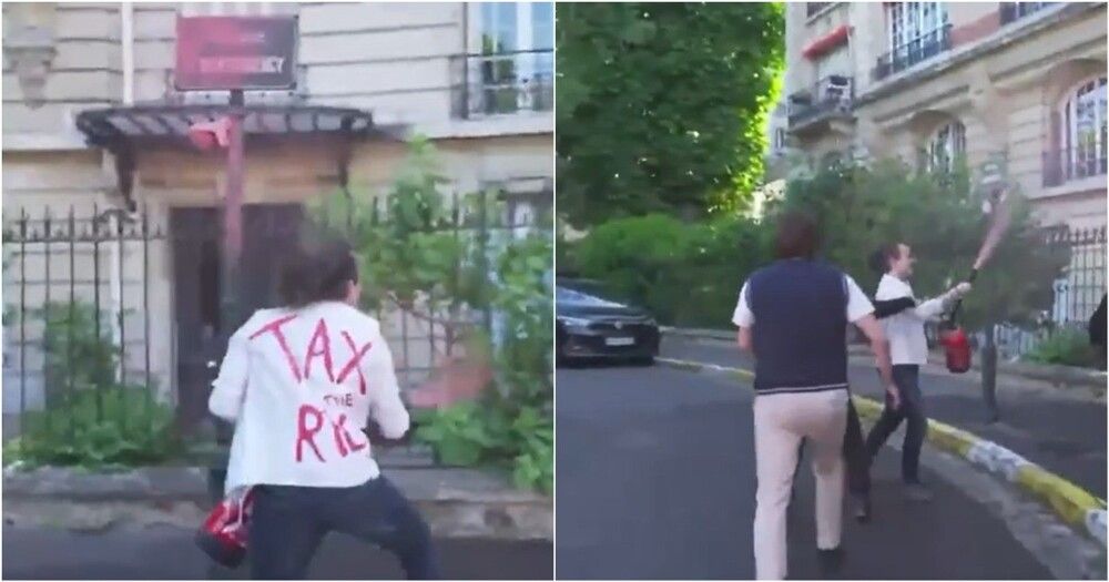 А теперь пару слов, куда они залезли. Вилла Монморанси - это закрытая и охраняемая резиденция, расположенная на холме в районе Отей. Созданный в XIX веке, он объединяет более сотни домов, ныне преобразованных в роскошные резиденции или частные особняки. Район является домом для многих бизнесменов, политиков и развлечений. Среди жителей и бывших жителей Винсент Боллоре, Жерар Депардье, Селин Дион, Милен Фармер, Жан-Поль Бодекру и Николя Саркози. Это место считается одним из самых эксклюзивных жилых районов Парижа.Так вот, около тридцати активистам повезло попасть в охраняемую жилую зону, где они на радостях, что их сразу не выгнали, принялись атаковать дома богатых парижан. По их словам, эта акция направлена на повышение осведомленности об ответственности самых богатых людей за разрушение планеты.Но так как по-настоящему вандалить очень страшно, акция получилась курам на смех. Особо храбрые даже надели футболки с надписью "Облагайте налогом богатых".Попшикали краской, стараясь ничего не испачкать особо ценного, пофоткались на память и, немного пошумев, свалили от греха подальше. Судя по всему, власть имущие так и не поняли, что это вообще было. Тяжела и неказиста жизнь простого активиста.