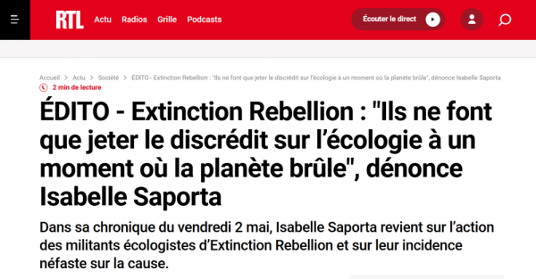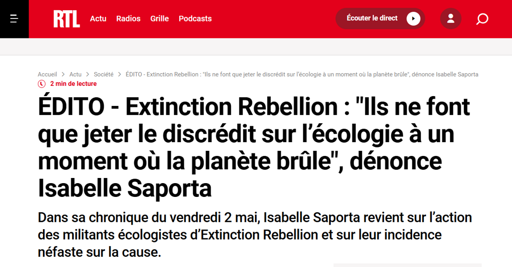 Движение Extinction Rebellion ("Восстание против вымирания") обычно организует зрелищные акции, часто незаконные, но ненасильственные, такие как блокирование дорог, захват общественных мест или нанесение символического ущерба.
