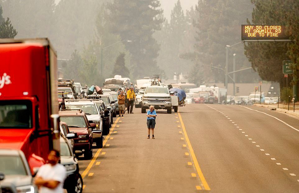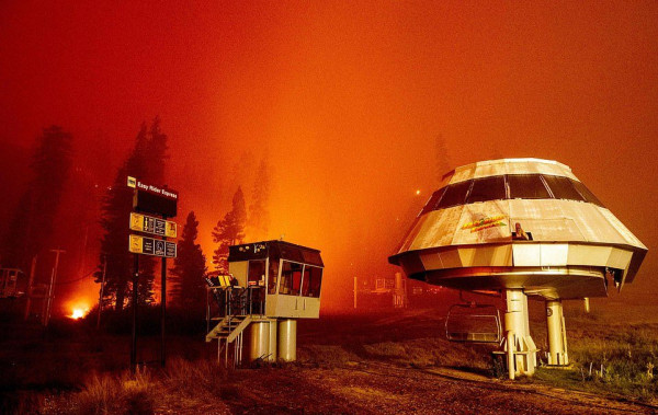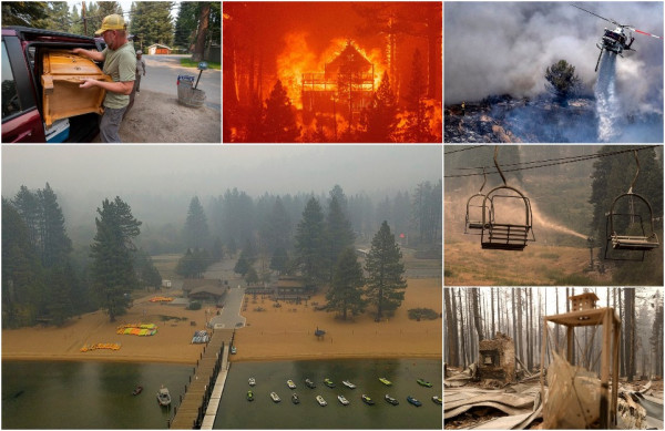 Менеджер горнолыжного курорта Сьерра-ат-Тахо Джон Райс, который управлял курортом площадью 2000 акров в Твин-Бриджес в течение почти трех десятилетий, рассказал газете San Francisco Chronicle, что в течение последних двух недель он наблюдал, как лесной пожар медленно приближается, пока, наконец, не достиг курорта в воскресенье, когда он наблюдал с крыши своего офиса."Он пришел с западной стороны, почти прямо к нам, эта большая стена огня", - рассказал он.Но Райс и его коллега-менеджер не были застигнуты врасплох и сделали все, что могли, в дни, предшествовавшие воскресенью, включая заклеивание воздуховодов, чтобы блокировать пепел, перемещение тяжелого оборудования на автостоянки курорта, чтобы уберечь от повреждений.Они также разумно использовали водяные гидранты в форме пушки, которые обычно используются для оснежения, и повернули их в сторону сооружений курорта, обливая их водой, чтобы они не загорелись.Это в сочетании с помощью контрактной команды из 12 человек, состоящей из отставных пожарных Cal Fire, которые помогли Райсу очистить ландшафт от сухих материалов, отпилить ветки бензопилой и облить наружные стены зданий огнезащитным гелем, позволило курорту пережить проходящий лесной пожар в целости и сохранности.Жители Южного озера Тахо вышли в социальные сети, чтобы показать необычно большие куски пепла, которые обрушились на их дома, когда огонь в Калдоре продолжает гореть и приближается к городу.На снимках видно, как Калифорния и Невада находятся в состоянии чрезвычайного положения, и был издан приказ об обязательной эвакуации 22 000 жителей города Саут-Лейк-Тахо.В понедельник днем свирепый лесной пожар пересек шоссе штата 50 и 89 и сжег горные хижины, спускаясь по склонам к бассейну Тахо.В течение двух недель пожар в Калдоре охватил 191 607 акров и остается локализованным лишь на 16 процентов, сообщило Министерство лесного хозяйства и противопожарной защиты Калифорнии.