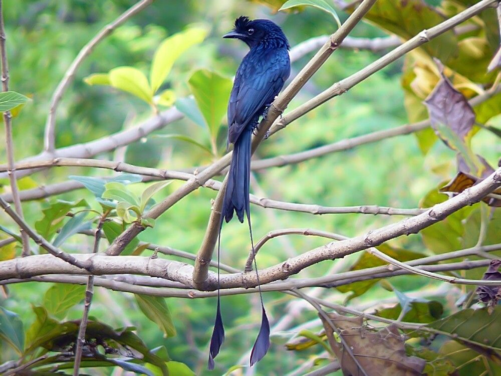 Большой ракетохвостый дронго отличается сильно вырезанным хвостом, сформированным очень длинными крайними рулевыми перьями. Большая часть стержней лишена опахала. За счёт такой особенности птица свободно порхает среди густой тропической растительности, не задевая ветви, поскольку перья располагаются параллельно телу и свободно развеваются в воздухе. А ещё эксперименты показали, что если укоротить перья, самец теряет привлекательность в глазах самок.